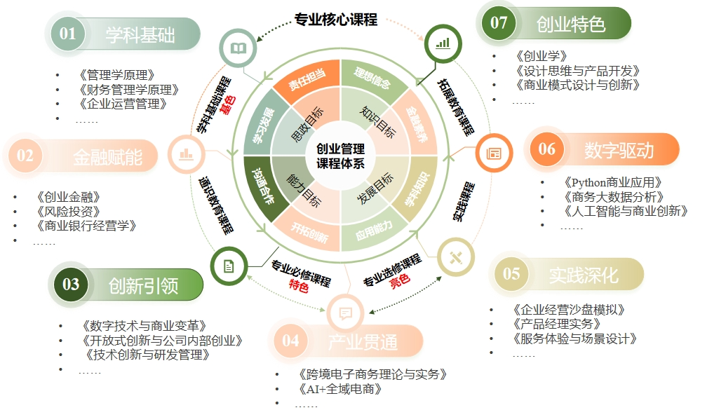 ·跨界协同:跨管理学、心理学、经济学等多学科,协同创业管理与应用心理学双专业,整合金融基础、专业理论、数智技能、应用实践四大类课程体系,致力于培养应用型、复合型高素质人才。