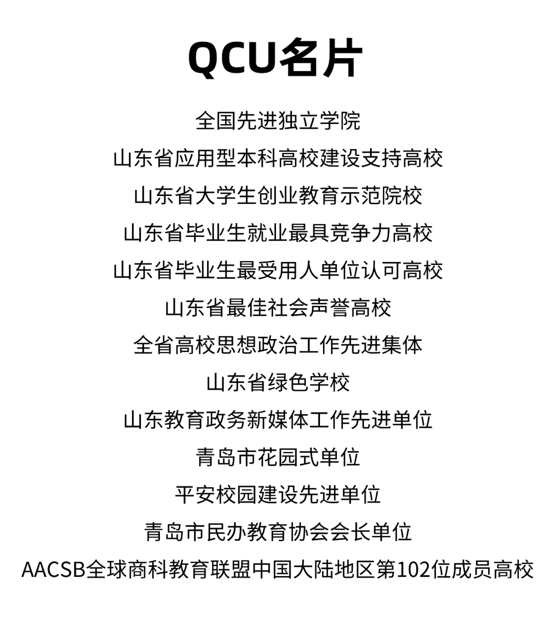 青岛城市学院(Qingdao City University ,英文简称QCU)创立于2004年,是国家教育部批准成立的全日制普通本科高校,前身是青岛理工大学琴岛学院。学校始终坚持以学生发展为中心,顺应高等教育发展趋势,融合国际国内优质教育资源,致力于培养面向未来、面向世界、面向城市的高素质应用型人才。学校获得了业内及社会的广泛认可,现已加入AACSB全球商科教育联盟成员,成为大陆地区第102位成员高校。在2025软科民办高校排名中,青岛城市学院位列全国12。