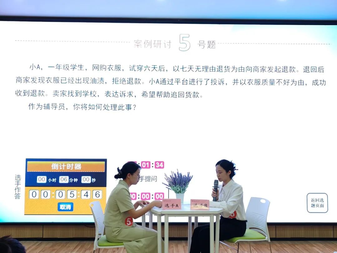 “案例研讨”环节聚焦学生工作真实场景,选手们赛前通过抽签组队,以“AB 角互问互答”模式深入剖析典型案例。围绕学业指导、心理疏导等辅导员九大工作职责,遵循“精准定性—深度剖析—对策研讨—规律总结”的逻辑,深入剖析典型案例,在思维碰撞中淬炼育人智慧。