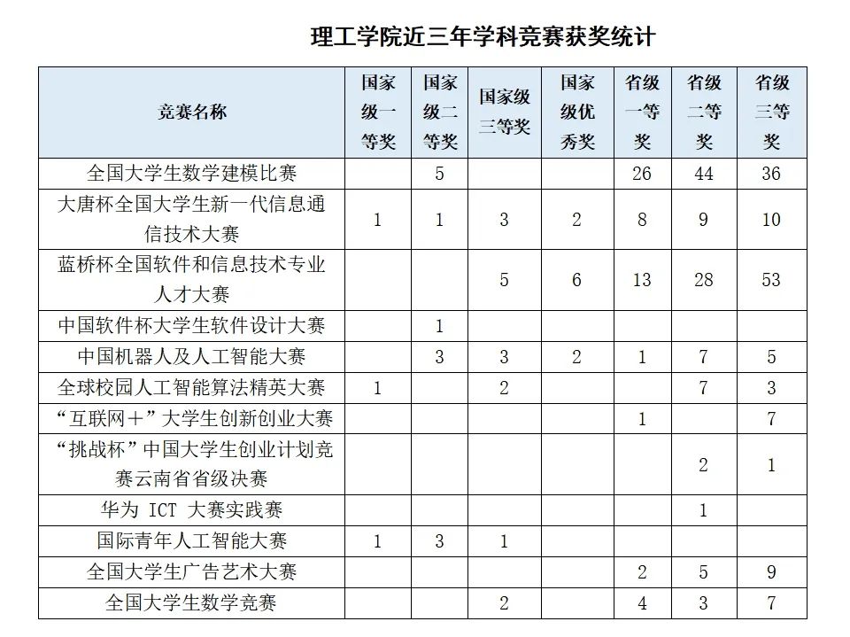 理工学院致力于构建以创新能力培养为核心的教育体系,通过打造一支兼具高水平学术技术能力、丰富实践经验与教学热忱的师资队伍,系统性组织学生参与“互联网+”、数学建模、蓝桥杯、大唐杯、中国机器人及人工智能大赛、全球校园AI算法精英大赛等高规格全国性科技竞赛,实现高达60%的学生参与率,有效促进跨专业、跨年级的学科专业交叉协作机制。近三年来,理工学院在该类高水平赛事中累计获省部级以上奖项334项,其中国家级奖项达42项,彰显卓越的创新人才培养成效与竞赛水平。