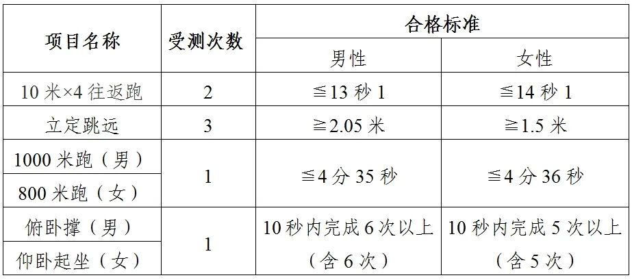 以上4个项目须全部进行测试,男生1000米跑、女生800米跑为必须合格的项目,另外3项需合格两项。达到前述条件的考生体能测试结论为合格。