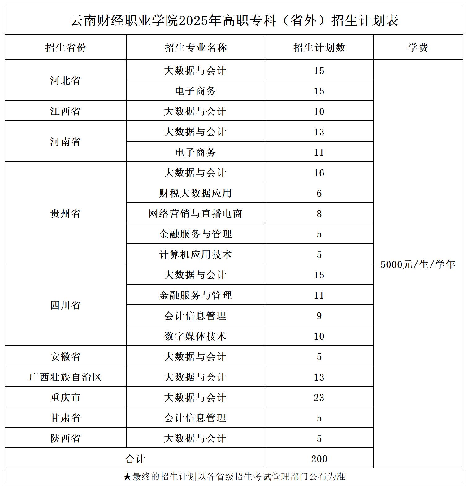 云南财经职业学院2025年高职专科(省外)招生计划表