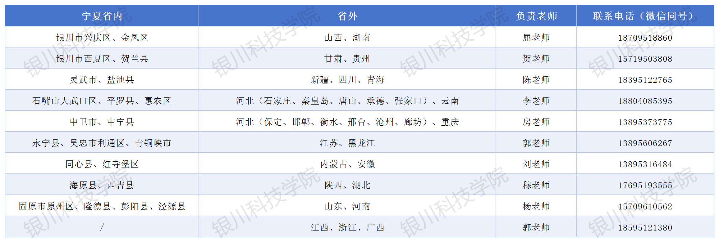 宁夏省内及各省负责老师联系方式
