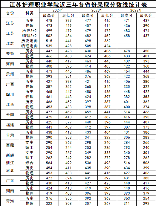 江苏护理职业学院近三年各省份录取分数线