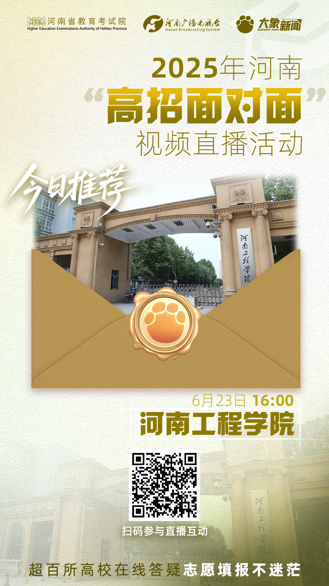 高招关键期,信息不容错过!6月23日16:00,河南省教育考试院、河南广播电视台、大象新闻联合举办的 2025 年河南 “高招面对面” 视频直播活动中,河南工程学院将重磅登场!