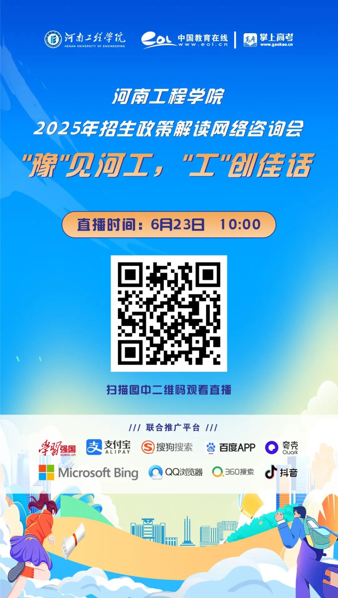 考生和家长们注意啦!河南工程学院2025年招生政策解读网络咨询会“豫”见河工,“工”创佳话 即将开启!6月23日10:00,您可以全面了解河南工程学院的招生政策,无论是录取规则、专业招生计划,还是院系介绍等,都有详细解读。扫描海报二维码,准时进入直播间,与招生团队线上交流,为报考之路答疑解惑!