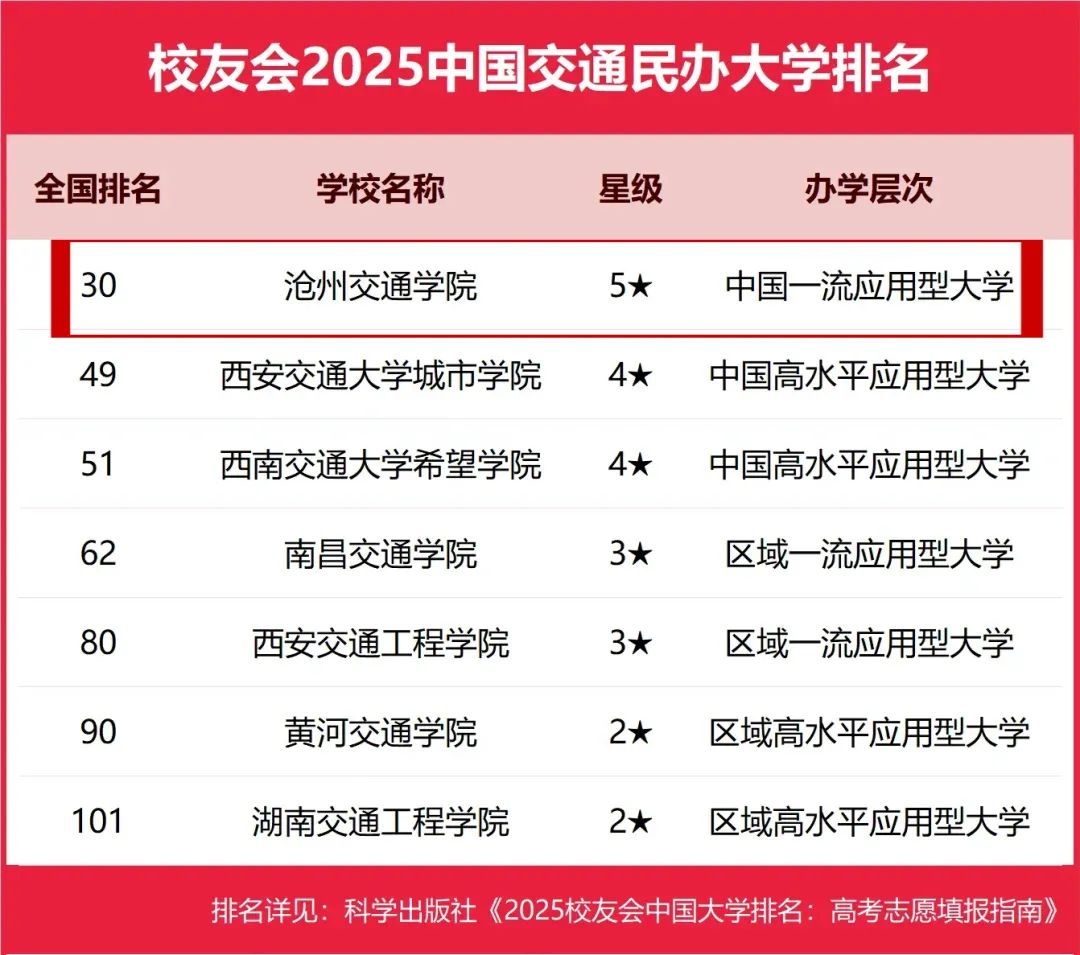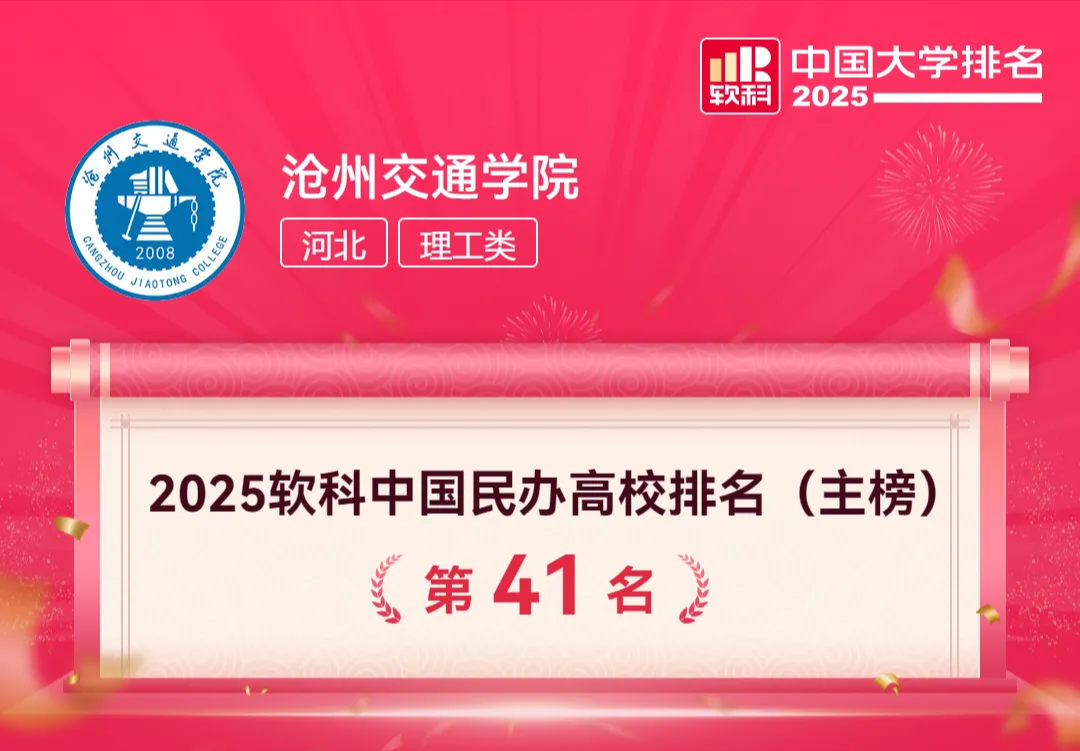 2025年在“软科中国”民办高校排名中荣获第41名,河北省第一;连续两年在艾瑞深校友会网荣获“中国交通民办大学排名第一”;2025年跻身艾瑞深校友会网中国民办大学Ⅰ类院校30强,排名位居省内同类院校第一;在阳光高考网荣登2025年河北省民办本科院校满意度榜首。