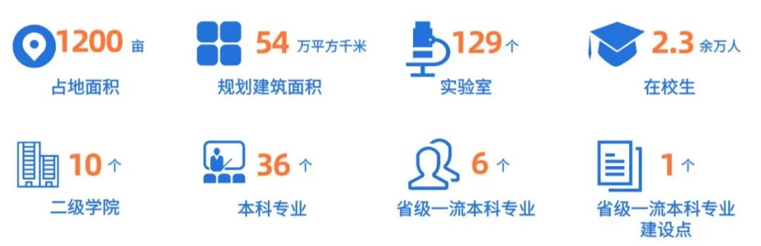 学校占地1200亩,规划建筑面积54万余平方米,已建成近39万平方米,三期工程15万余平方米建筑已全面开工建设。拥有现代化的教学楼、实验楼、体育馆等基础设施,建有标准化体育场、大学生活动中心等各类文体活动场馆。