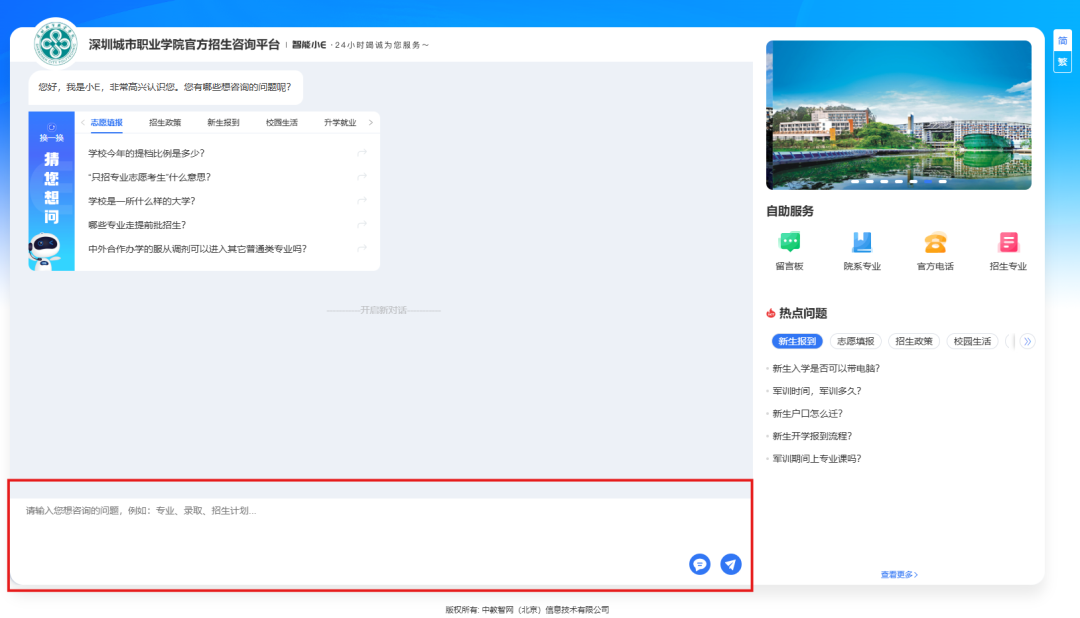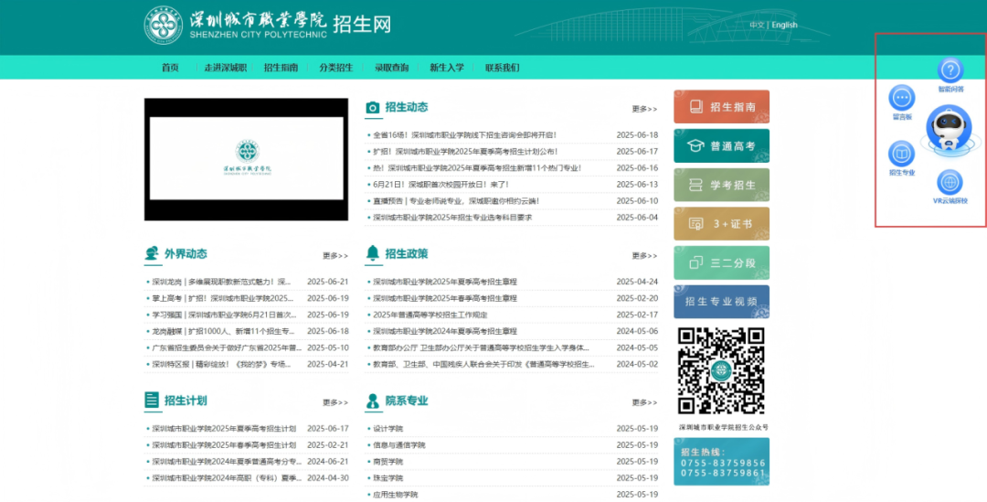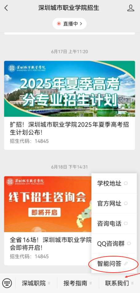 访问方式:通知深圳城市职业学院招生公众号以及招生网,即可轻松进入我校智能问答系统。
