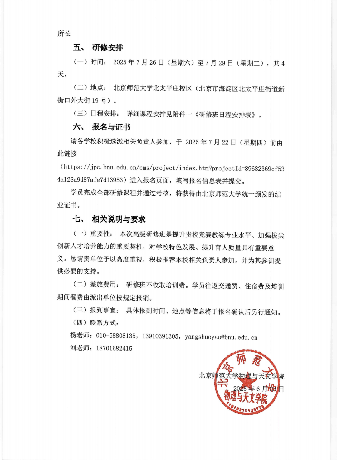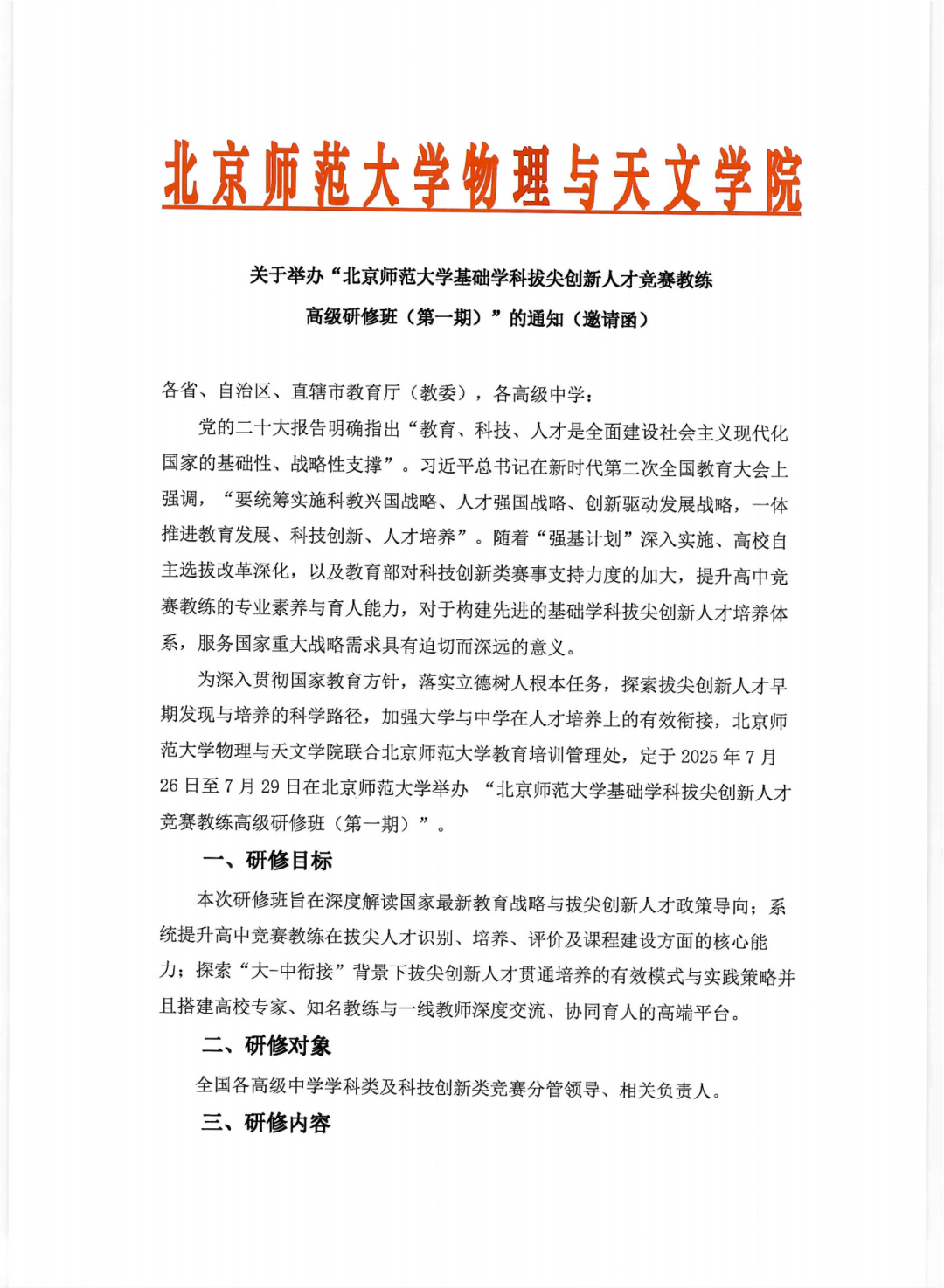 关于举办“北京师范大学基础学科拔尖创新人才竞赛教练高级研修班(第一期)”的通知(邀请函)