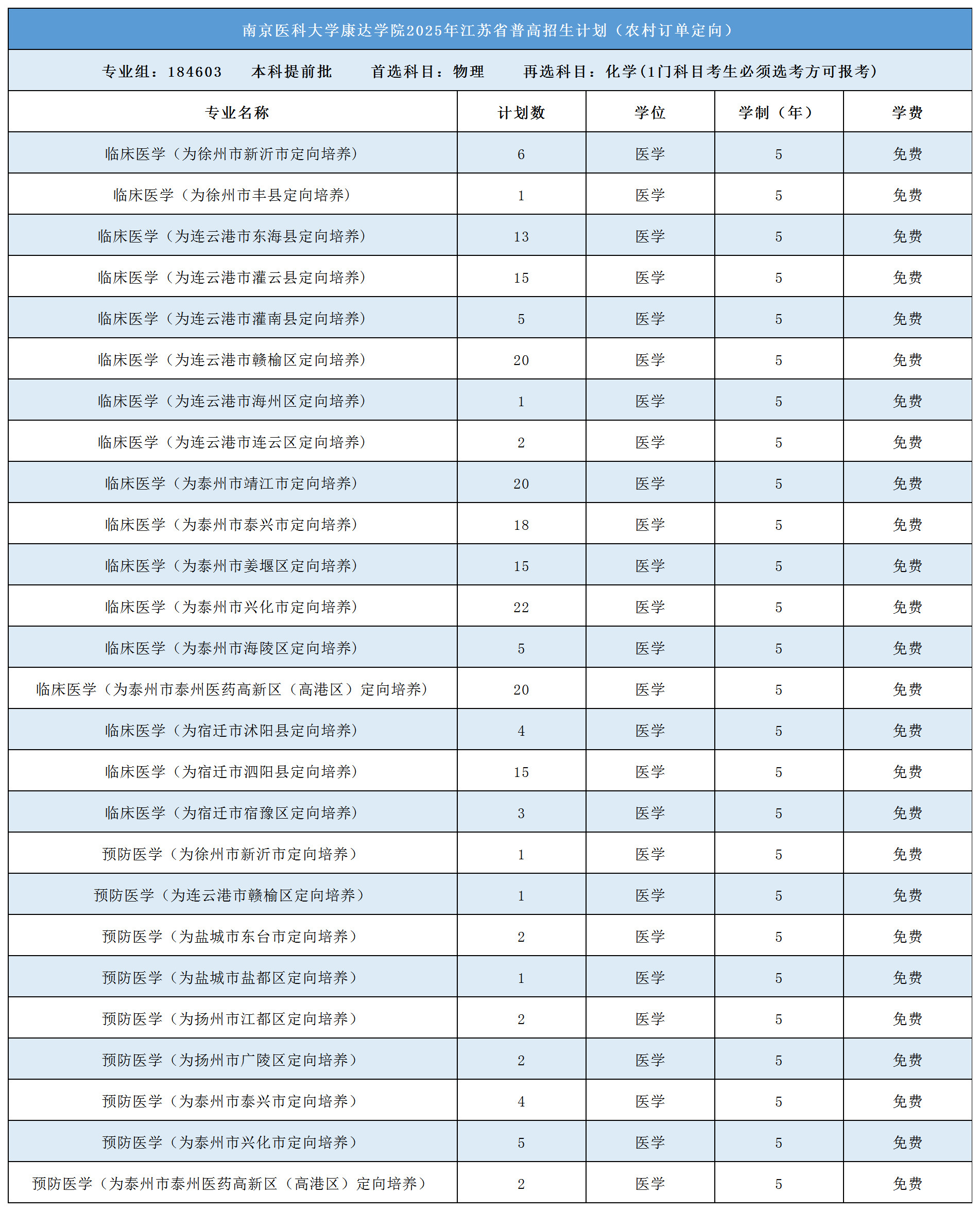 南京医科大学康达学院2025年江苏省普高招生计划(农村订单定向)