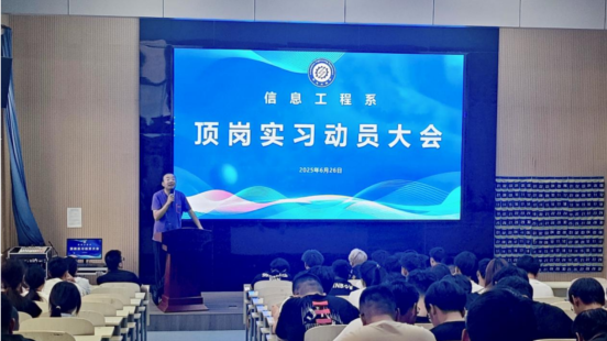 6月26日,信息系2023级学生顶岗实习动员会暨企业宣讲会在东校区四楼阶梯教室召开,为即将奔赴实习岗位的140余名学子答疑解惑,系党总支副书记连璞、辅导员郝瑞琪、冯鑫、23级