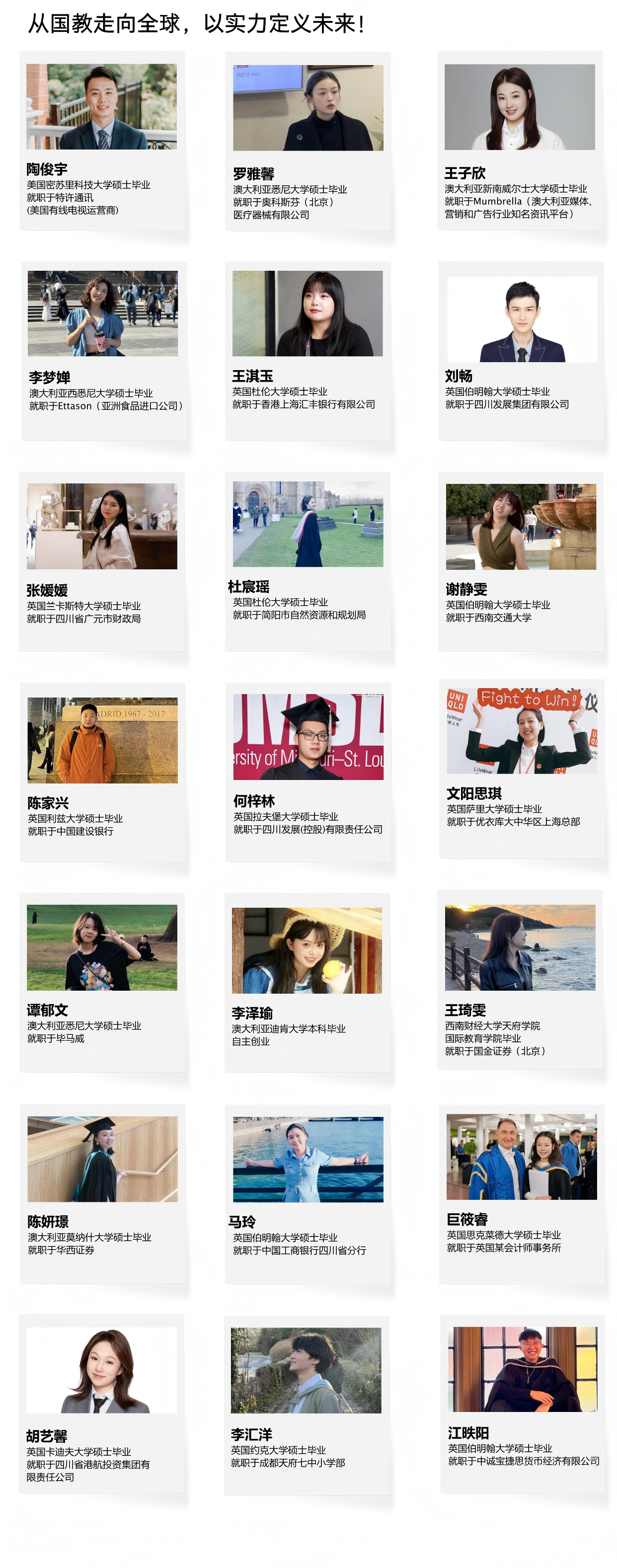 多年的海外留学经历,扎实的专业知识和语言能力,显著增强了学生就业竞争力。已毕业学生绝大多数选择留在海外发展或回国就职于世界500强等跨国企业。