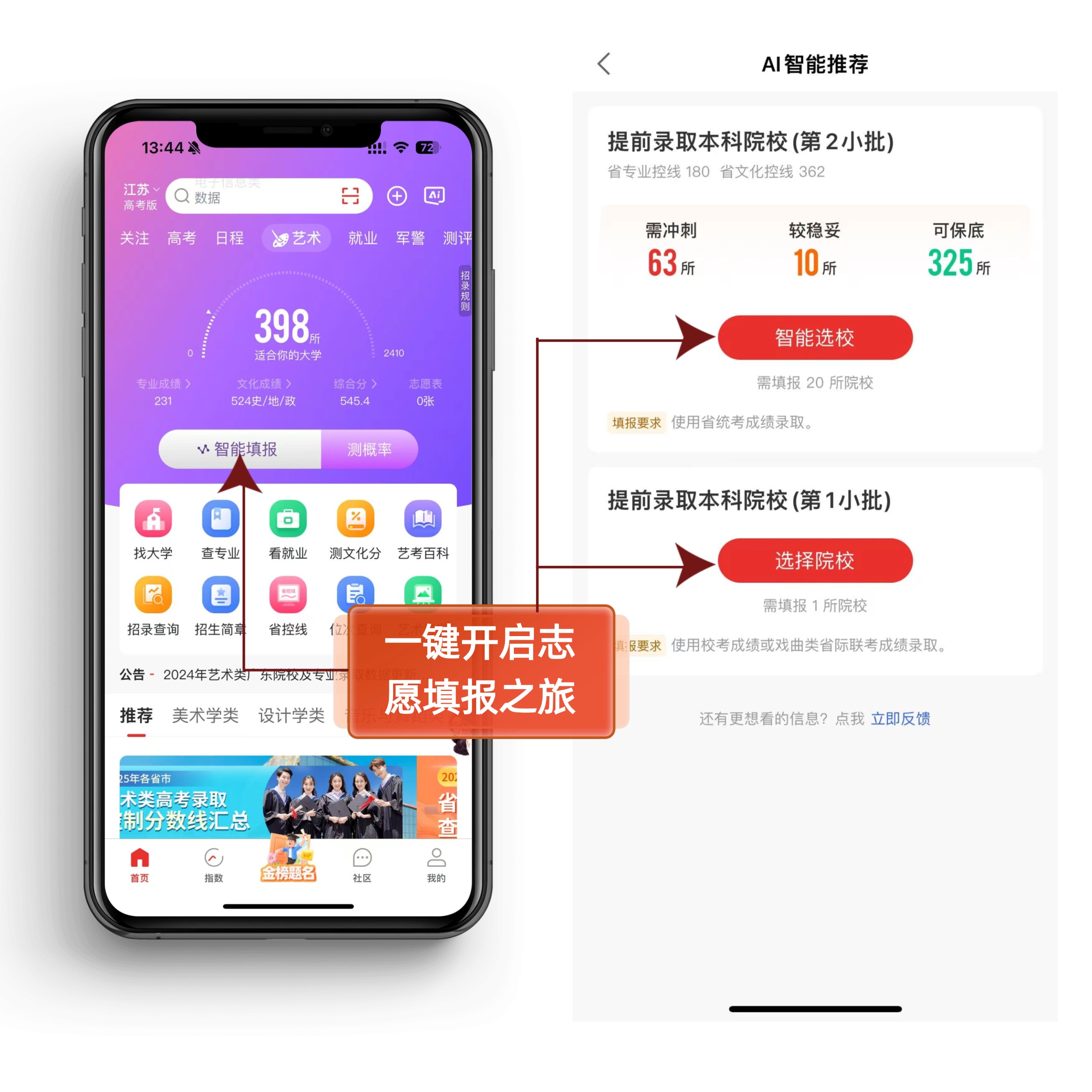 如果你对志愿填报一窍不通,毫无经验和技巧,别担心,建议使用优艺考的【智能填报】功能,系统会根据您输入的成绩以及院校信息告知您被院校及专业录取的概率是多少供您参考。