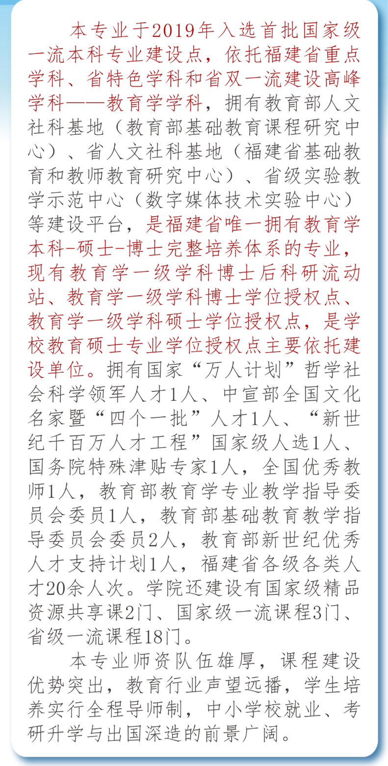 为帮助广大考生与家长深入了解我校各个国家级一流本科专业建设情况,招生与考试办公室于今年特别推出“国家级一流本科专业建设点巡览”专栏,共分两期。第一期为大家带来18个获批国家级一流本科专业建设点的师范类专业,分别是:汉语言文学、思想政治教育、体育教育、教育学、学前教育、小学教育、数学与应用数学、物理学、历史学、化学、生物科学、地理科学、英语、汉语国际教育、心理学、音乐学、舞蹈学、美术学,以上专业均在本科提前批、体育类本科批、艺术类本科省考批三个志愿批次招生。