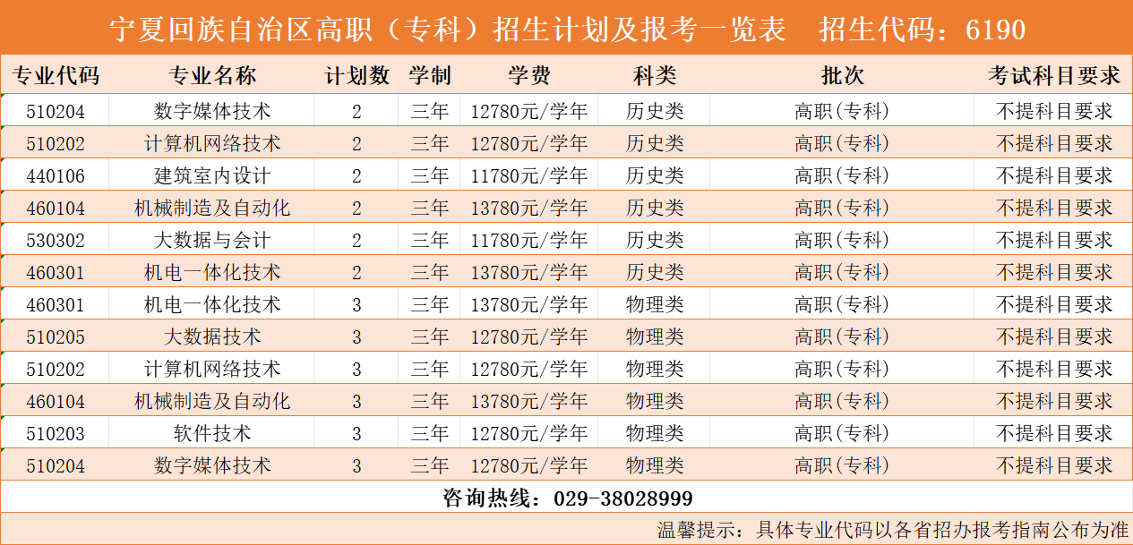 宁夏回族自治区2025年招生计划(招生代码:6190)