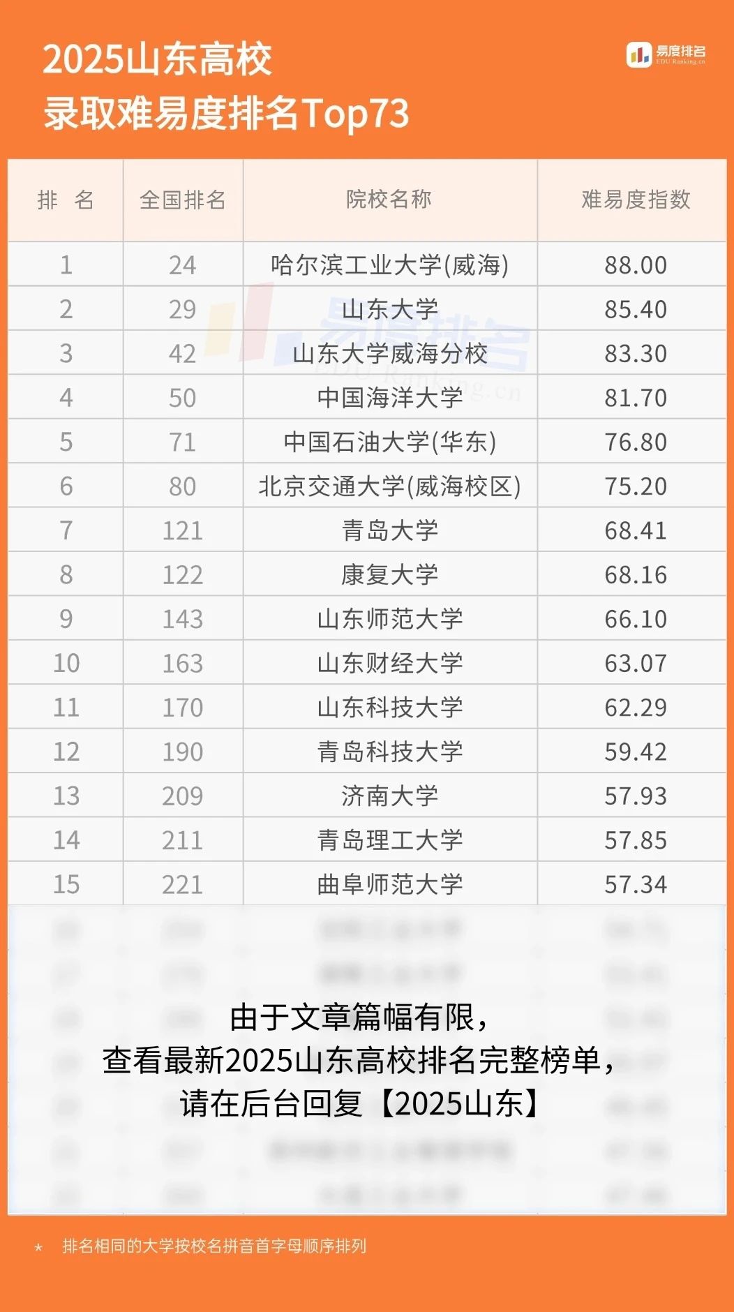 各分段考生可根据难易度指数选择适合自己的学校。如需查看73所院校的完整榜单,可关注【易度排名】公众号,后台私信回复“2025山东”。