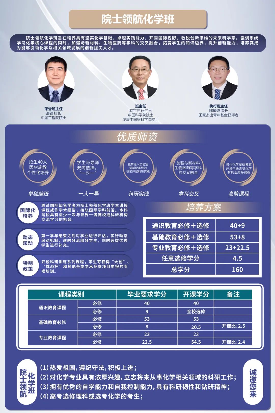 暨南大学“院士领航”化学班旨在培养具有坚实化学基础、卓越实践能力、开阔国际视野和敏锐创新思维的未来科学家。