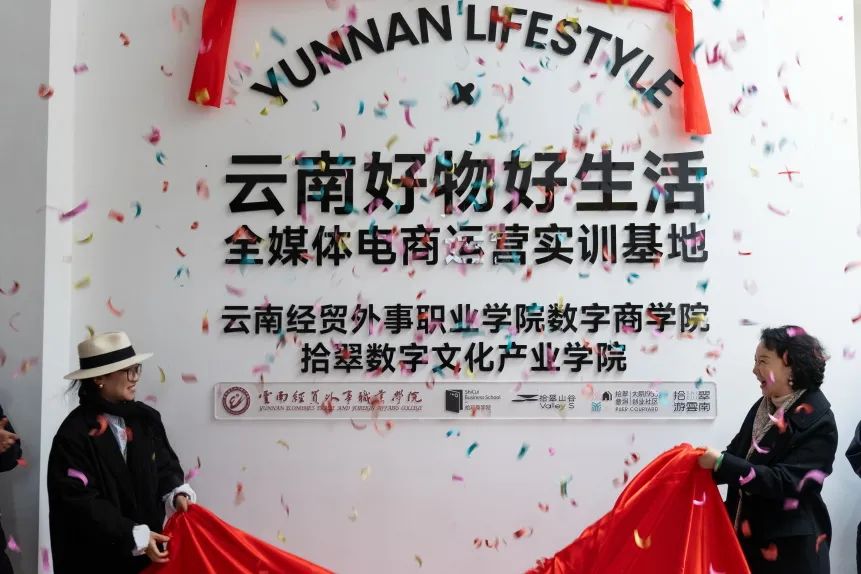 学校与拾翠品牌共建的云南好物好生活全媒体电商运营实训基地、云南经贸外事职业学院数字商学院拾翠数字文化产业学院揭牌仪式