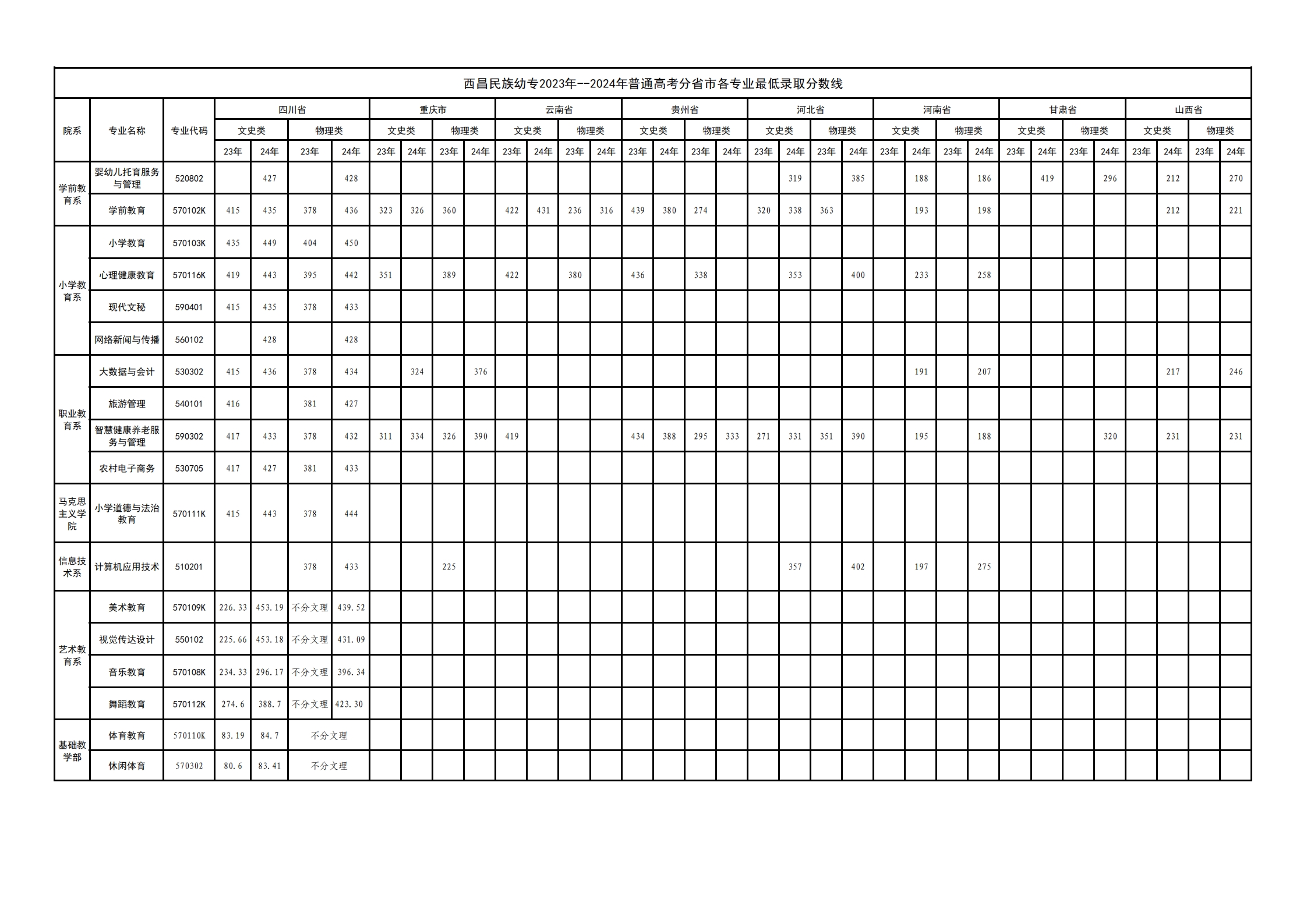 西昌民族幼专2023年--2024年普通高考分省市各专业最低录取分数线