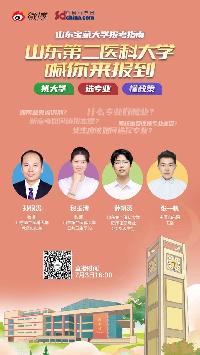 7月3日18:00,中国山东网连麦山东第二医科大学招生办,为你带来山东第二医科大学最权威的报考指南,欢迎各位考生和家长扫描二维码进入山东第二医科大学微博直播间、中国山东网微博直播间咨询互动,嘉宾现场为你答疑解惑!
