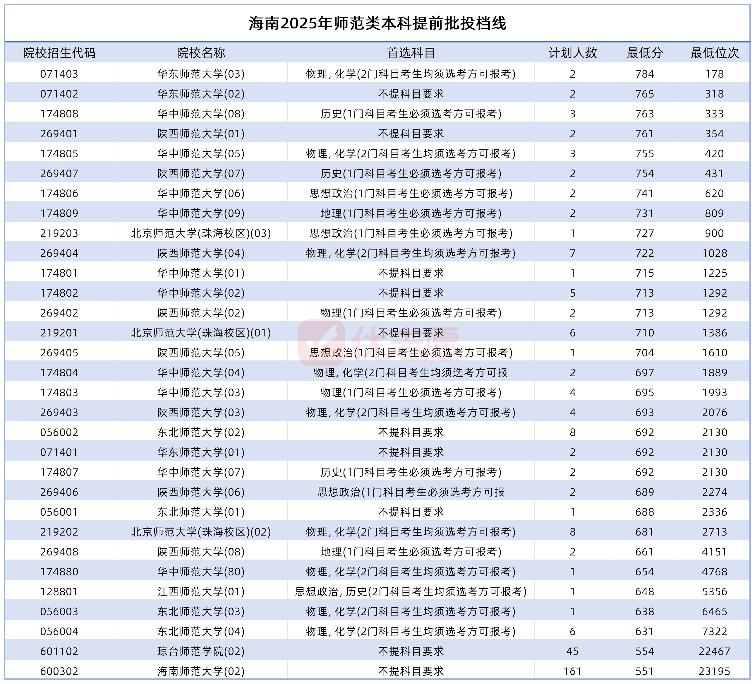 在海南提前批投档中,师范类院校以显著优势领跑。其中,华东师范大学03组物理类以784分(位次较去年提升1029位)稳居榜首,究其原因,主要体现在以下两个方面: