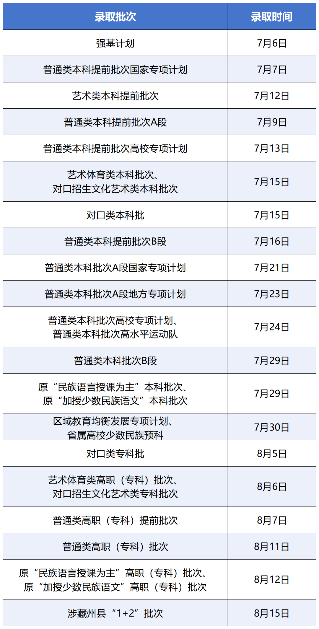 这里,川小招特意为大家梳理了普通类主要批次的预计录取时间,如普通类本科提前批次B段、普通类本科批次B段、普通类高职(专科)提前批次、普通类高职(专科)批次的预计录取时间分别是7月16日、7月29日、8月7日、8月11日,建议大家及时关注。