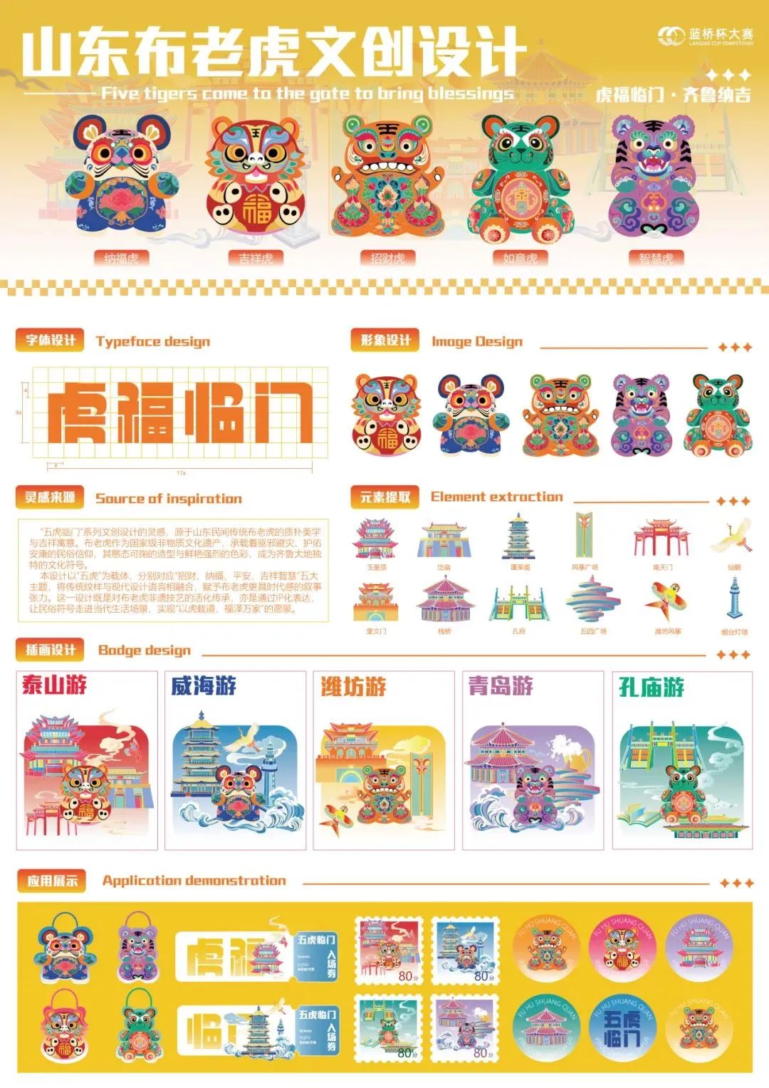 设计说明:“五虎临门”系列文创设计灵感源自山东民间传统布老虎,承袭其驱邪避灾、祈福纳祥的民俗信仰与质朴美学。作为国家级非遗,布老虎以憨态造型与鲜明色彩成为鲁地文化象征。本设计以“纳福、平安、吉祥、智慧、招财”五大主题,构建“福虎五象”,融合传统纹样与现代设计语言,赋予非遗符号新的时代张力。既展现技艺活化传承,亦通过IP化路径让文化融入日常,实现“以虎载道,福泽万家”的美好愿景。