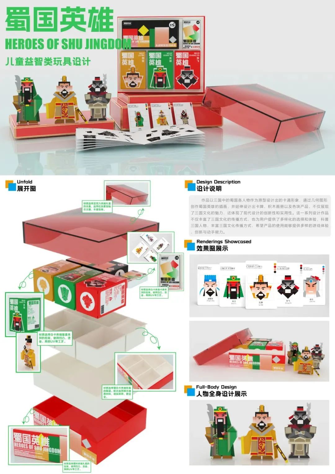 设计说明:作品以三国中的蜀国各人物作为原型设计出的卡通形象,通过几何图形创作蜀国英雄的插画,并延伸设计出卡牌、积木画册以及色块产品,不仅展现了三国文化的魅力,还体现了现代设计的创新性和实用性。这一系列设计作品不仅丰富了三国文化的传播方式,也为用户提供了多样化的选择和体验,科普三国人物,丰富三国文化传播方式,希望产品的使用能够提供多样的游戏体验创新与动手能力。