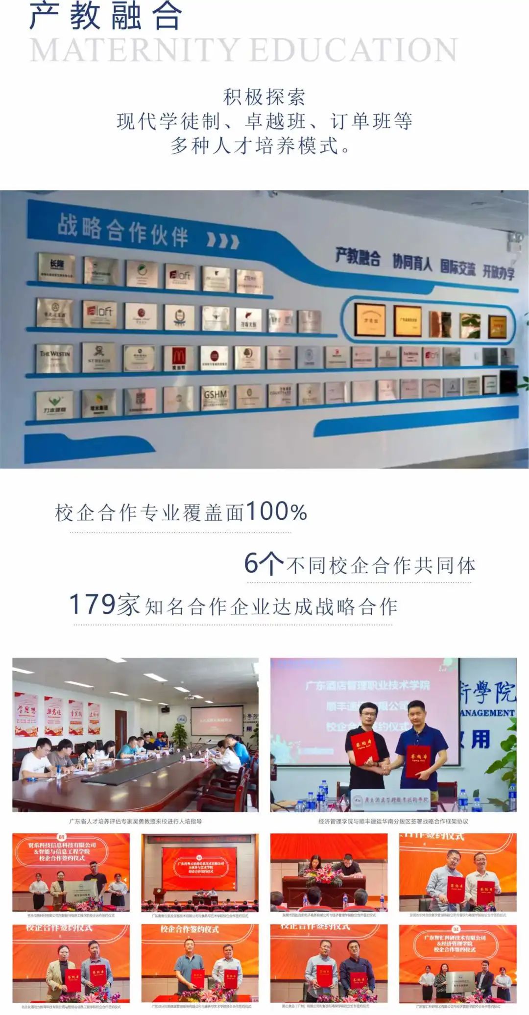 学校成立专门的校企合作办公室,为校企深度融合搭建了平台。积极探索校企深度合作途径,建设产教融合高端平台,推动与行业优质企业、领军企业与学校合作育人、合作就业、合作发展。并在校企合作机制建设、教育资源共享、教师挂职锻炼、学生顶岗实习、校企合作育人等方面成效显著。 与万豪、洲际、凯悦、希尔顿等国际品牌酒店集团建立了6个不同类型的校企合作共同体,稳步推进,与万豪酒店合作共建的招生、培养、就业一体化校企合作项目,形成了多种合作模式校企合作,专业覆盖面达100%。结合行业特点,与珠海长隆、万豪国际等国内外179家知名企业达成战略合作,积极探索现代学徒制、卓越班、订单班等多种人才培养模式。结合行业特点,与珠海长隆、香港大学、万豪国际等国内外179家知名企业达成战略合作,积极探索现代学徒制、卓越班、订单班等多种人才培养模式。产教融合共育直播电商人才,助力厚街制造产业腾飞优秀企业家进校园 | 东莞轨道交通助力我校学子实现高质量就业