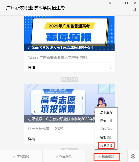 公众号搜索并关注“广东新安职业技术学院招生办”,点击底部的“招生服务”按钮,进入“志愿填报”网址。
