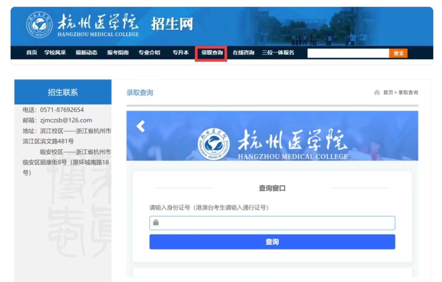 考生可登录“杭州医学院招生网”,菜单栏选“录取查询”,输入身份证号,点击查询即可。最终录取以浙江省教育考试院查询为准。