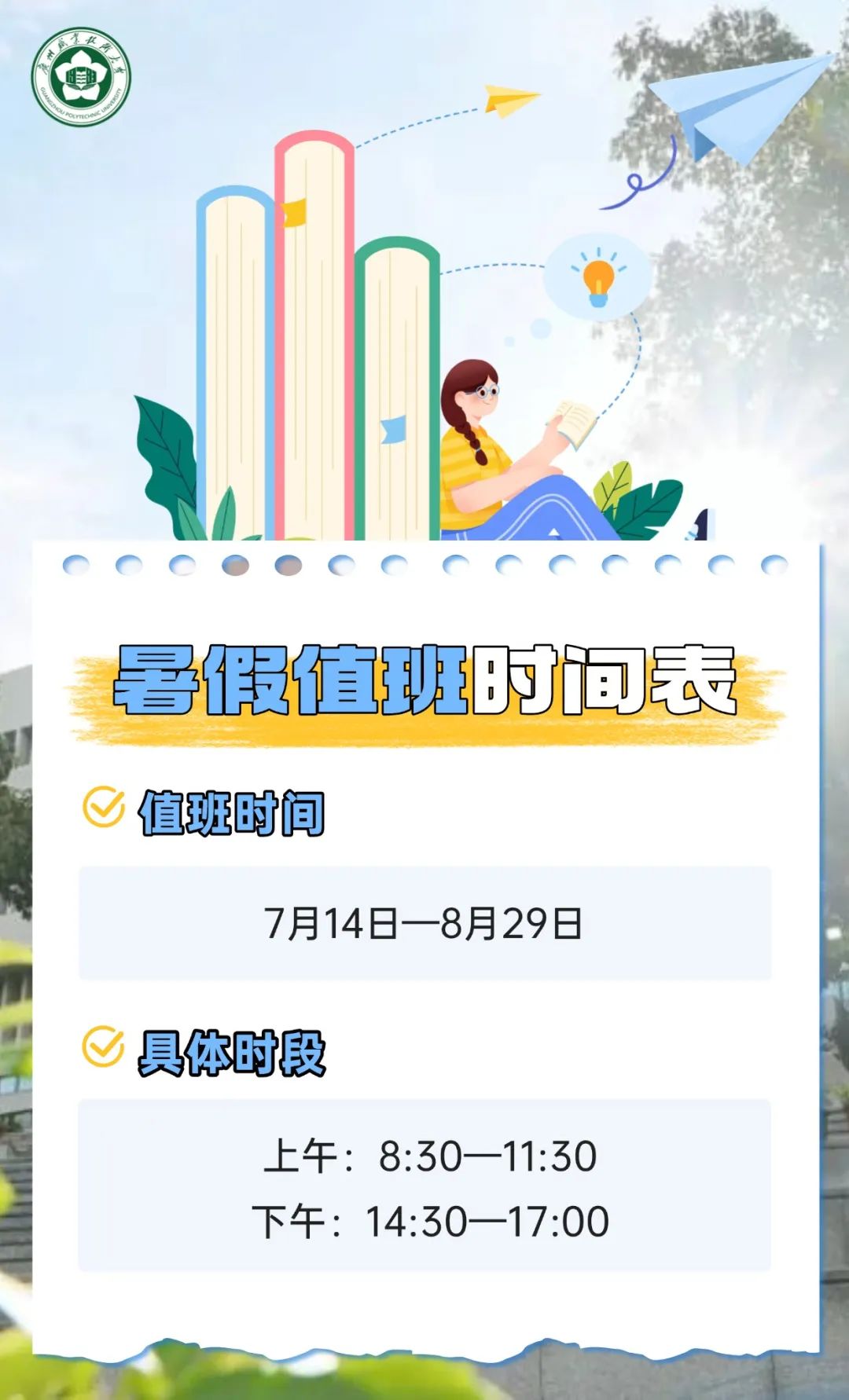 随着暑期正式开启,学校大部分同学已离校返家。为帮助新生快速熟悉校园环境、及时解答各类咨询,特安排大师兄暑期值班。现将具体服务时段公布如下,请有需求的同学注意查阅:
