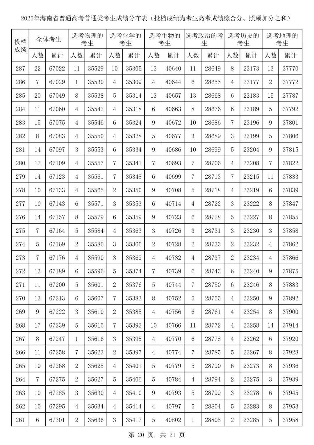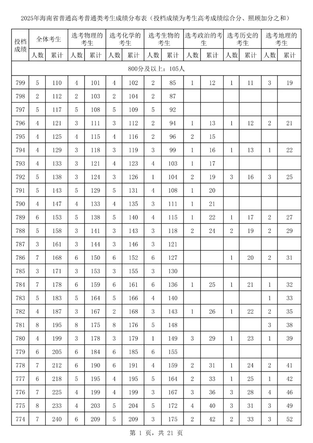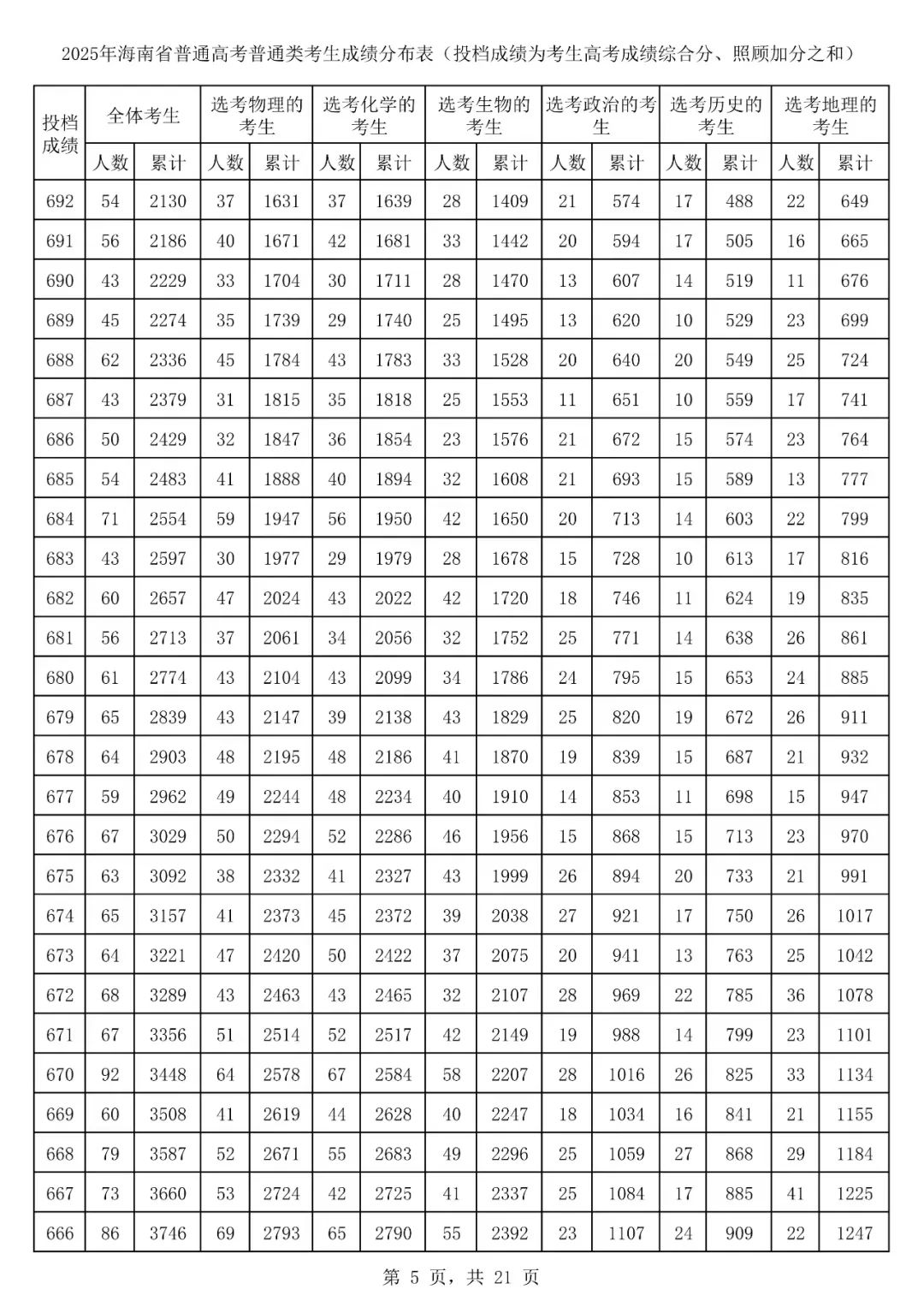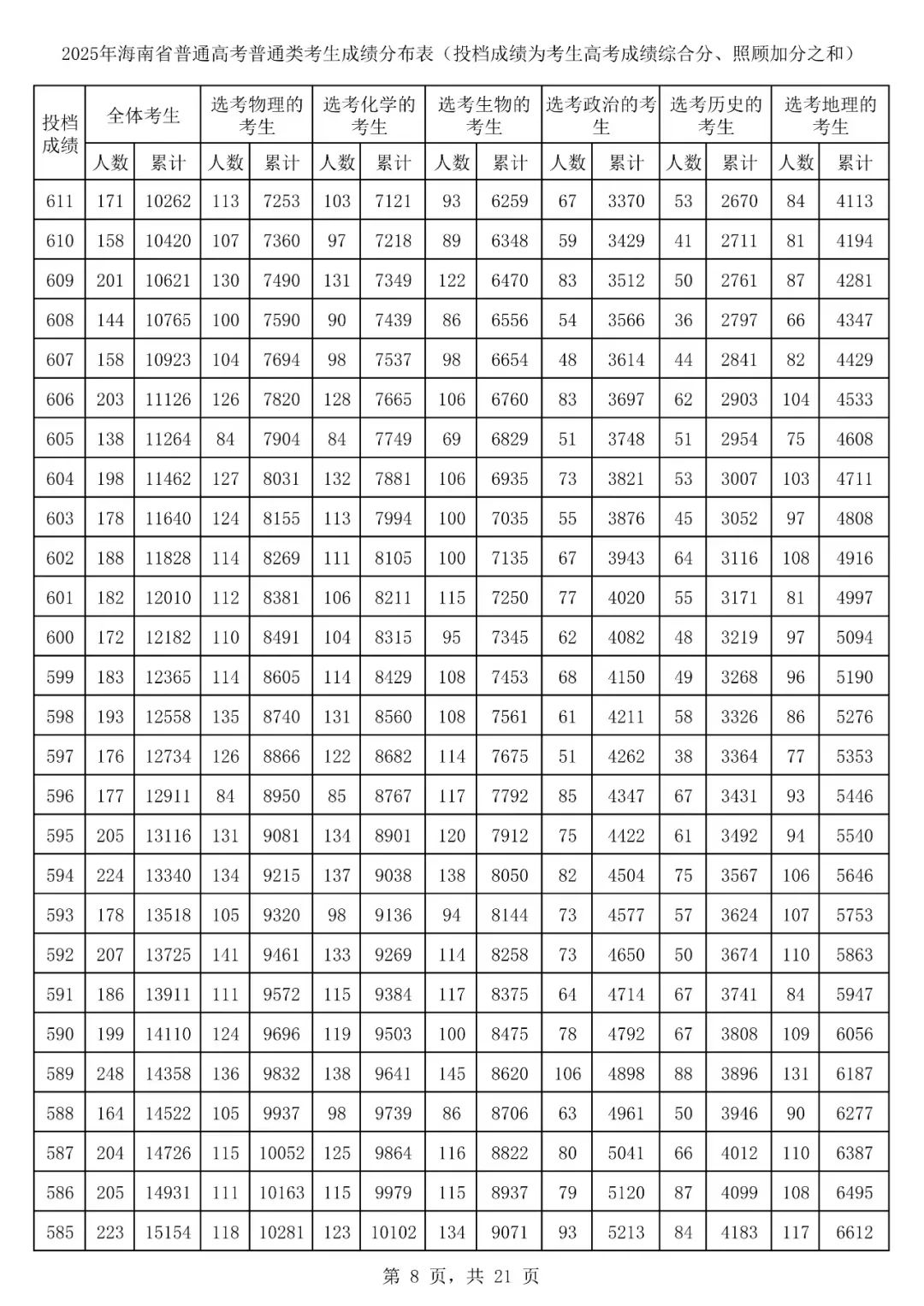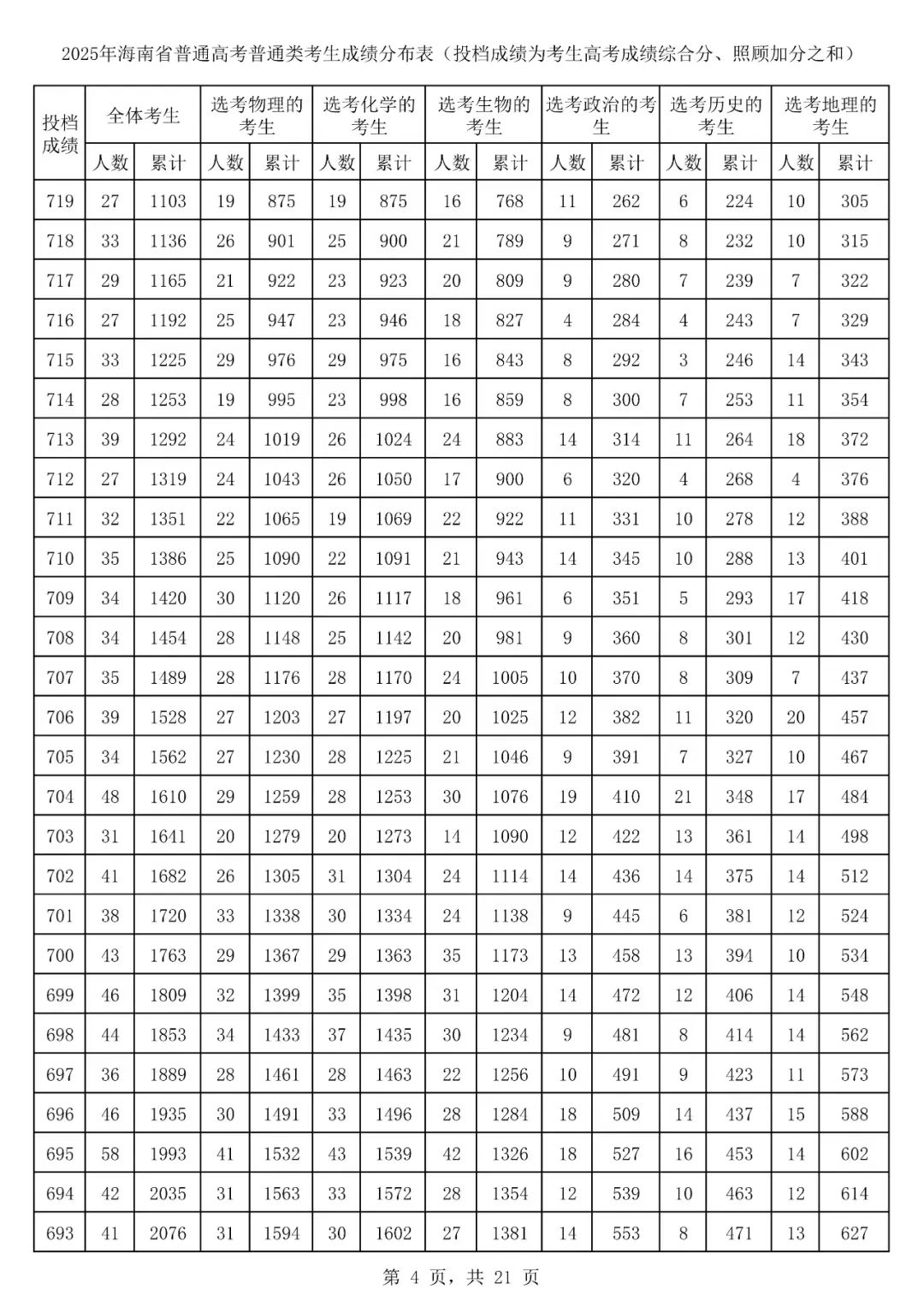 四、2025年海南省普通类考生成绩分布表(一分一段)