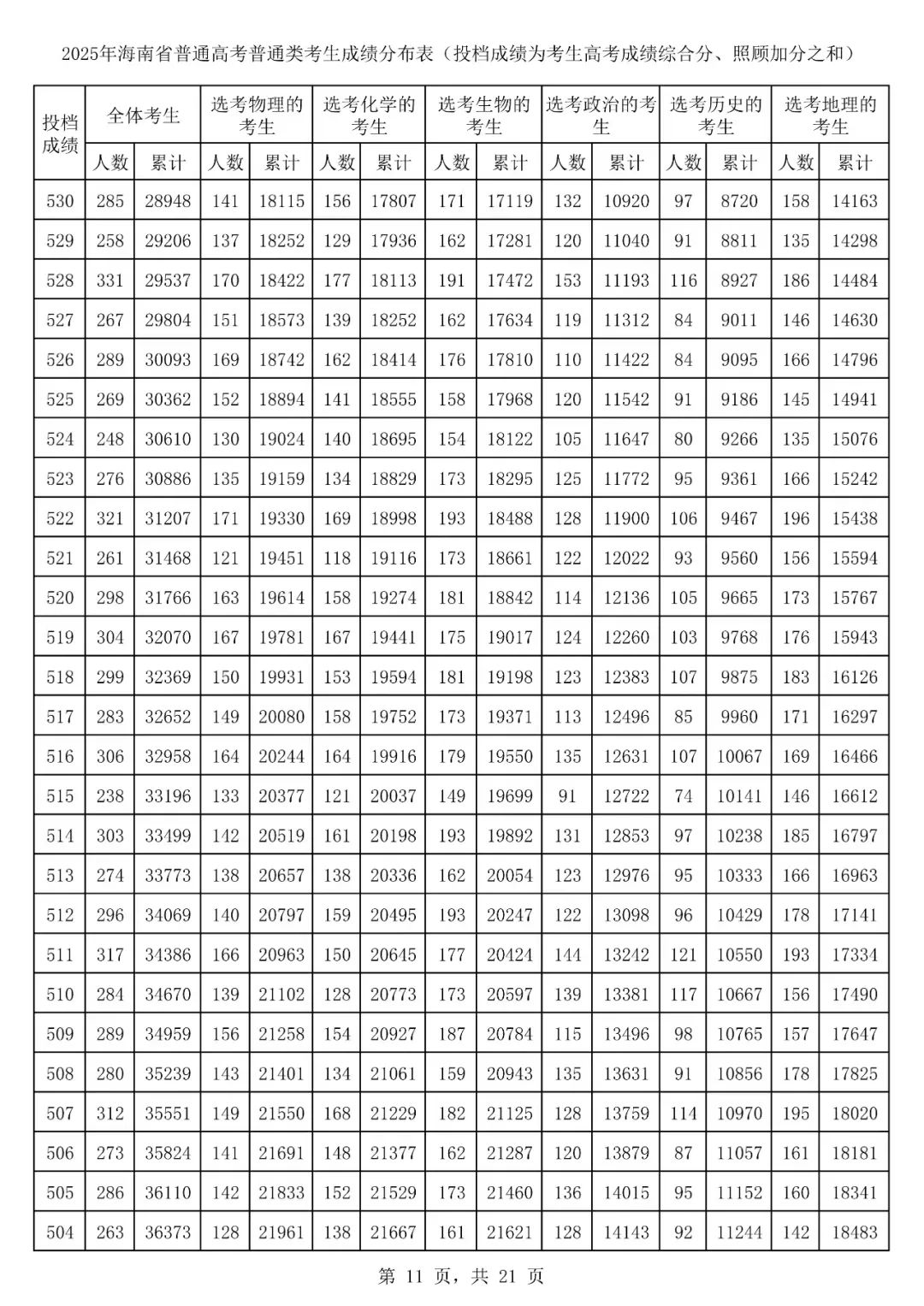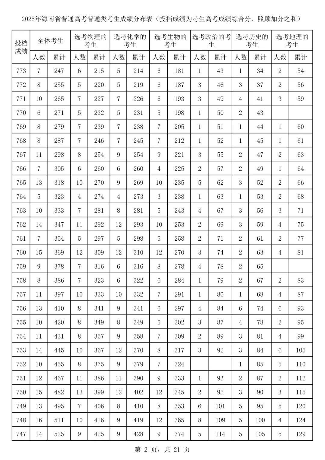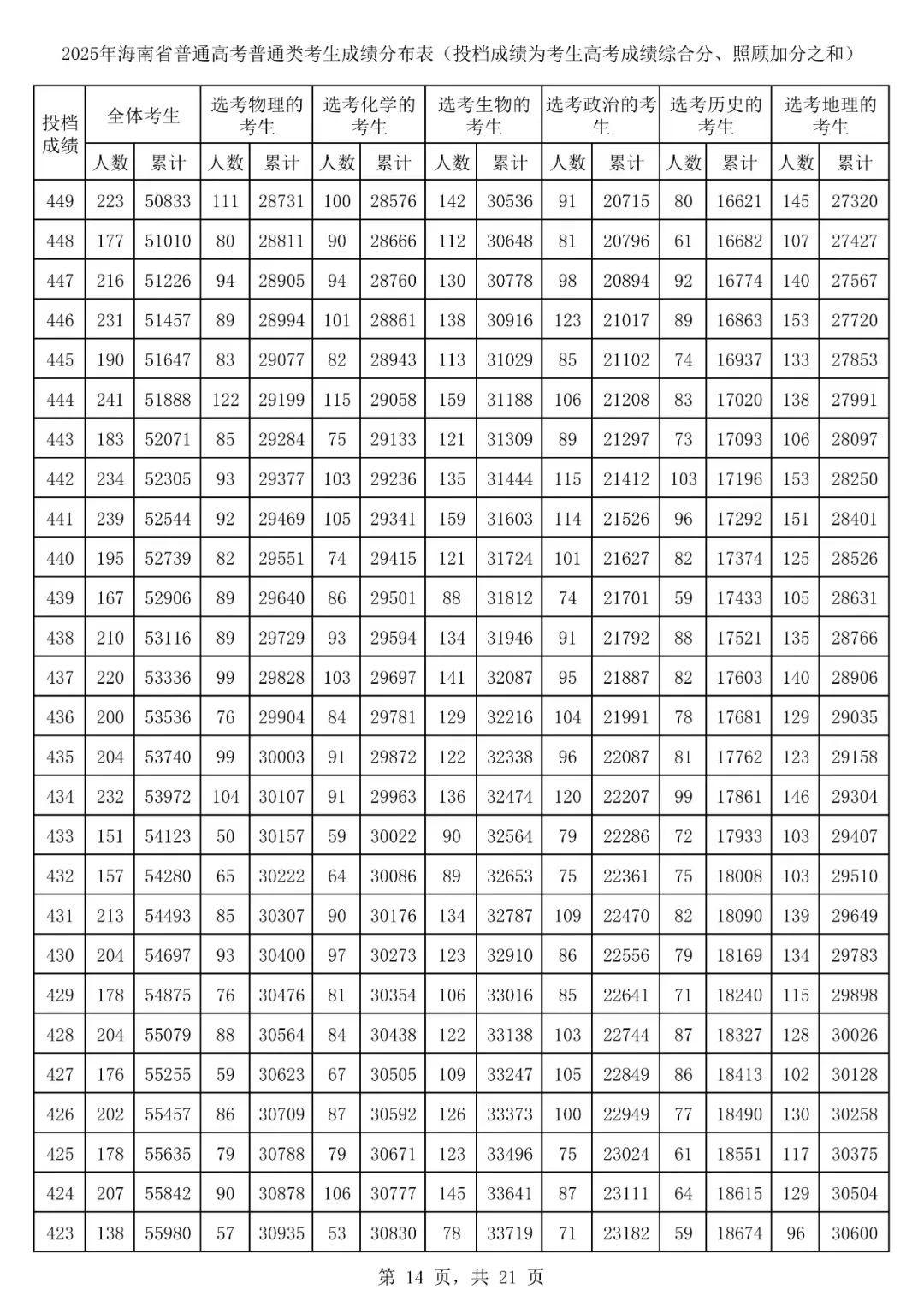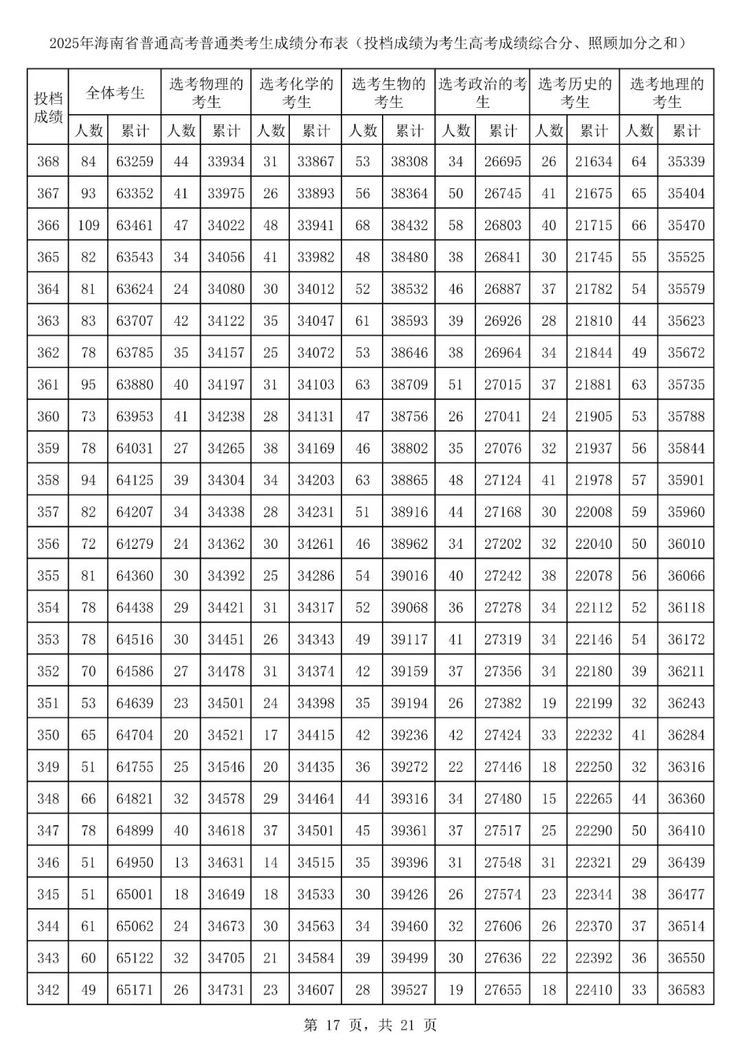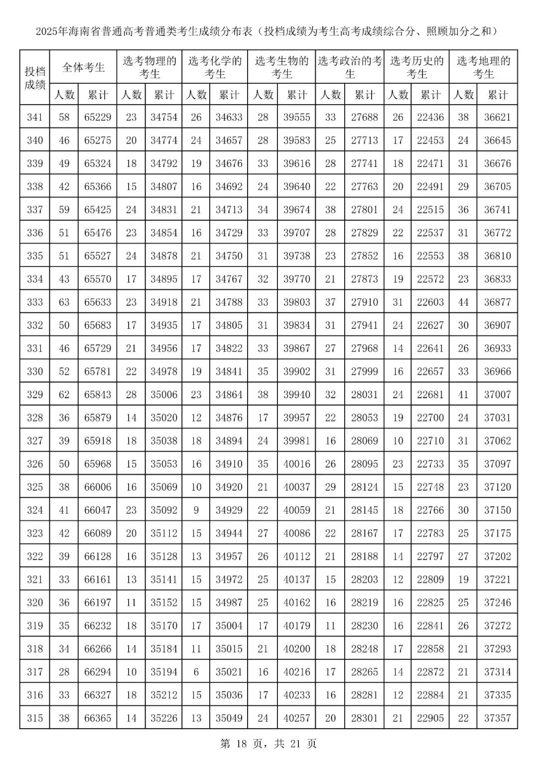 四、2025年海南省普通类考生成绩分布表(一分一段)