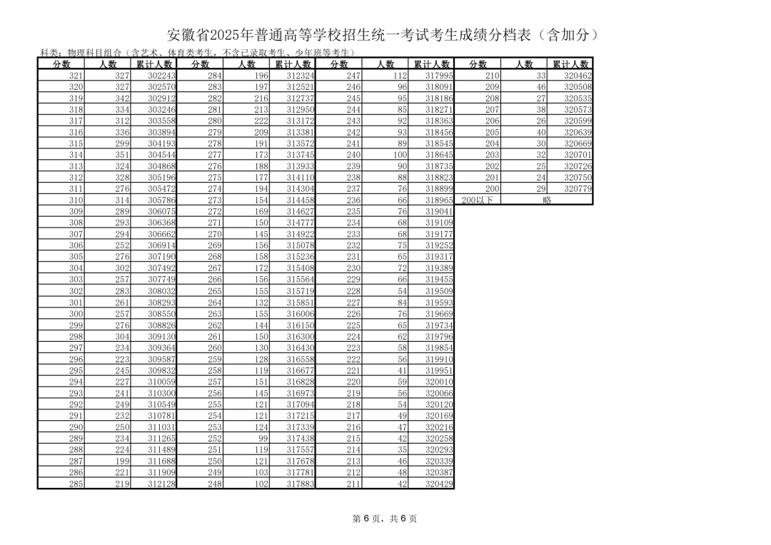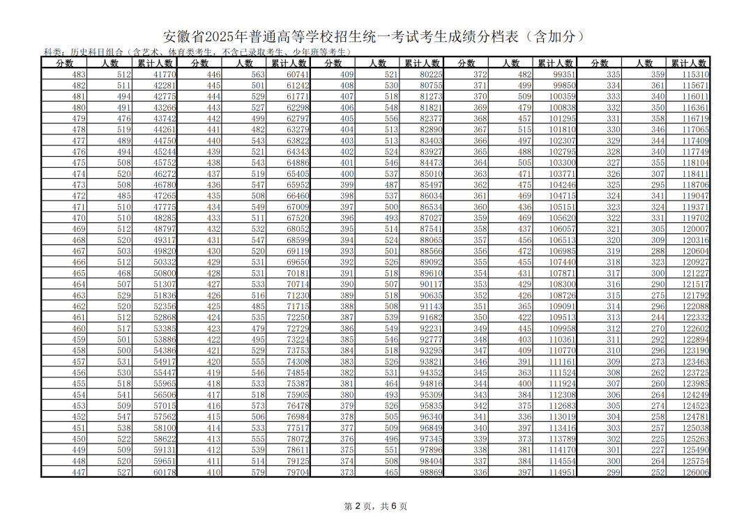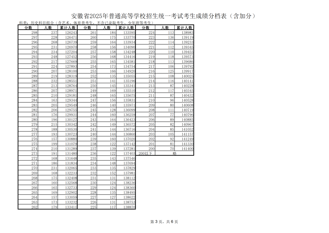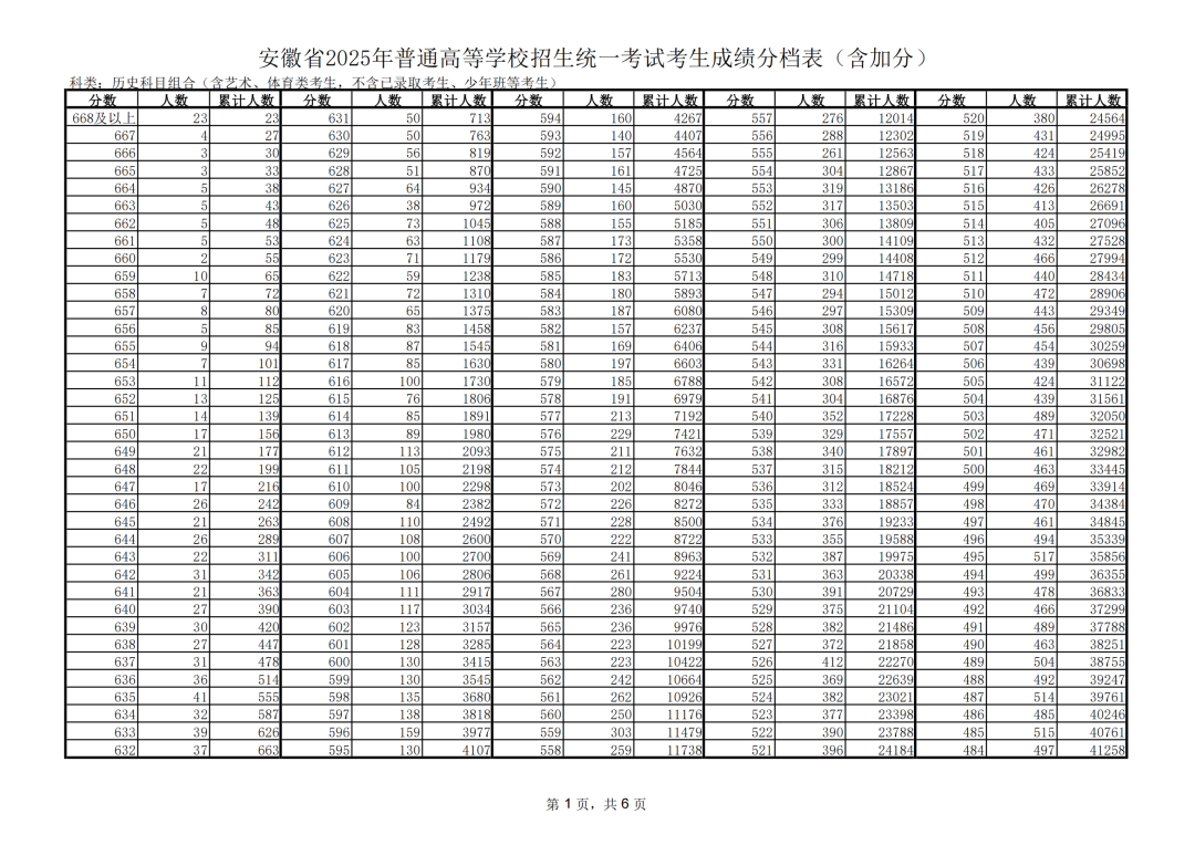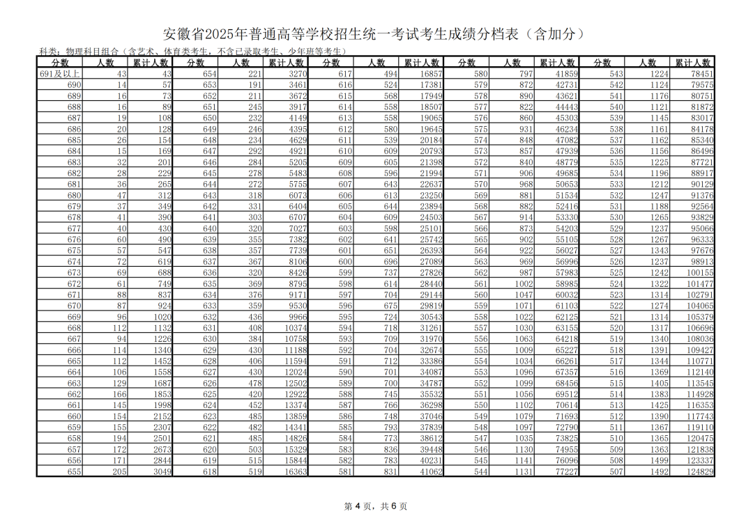 四、安徽省2025年普通高等学校招生统一考试考生成绩考档表(一分一段)