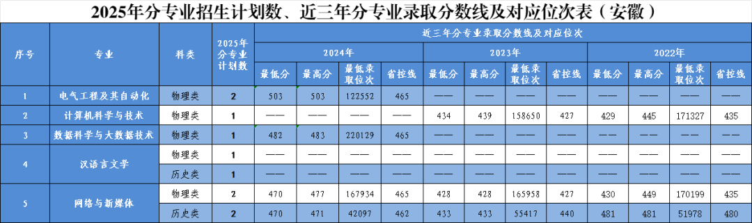 一、2025安徽省分专业招生计划数,近三年分专业录取分数线及对应位次表