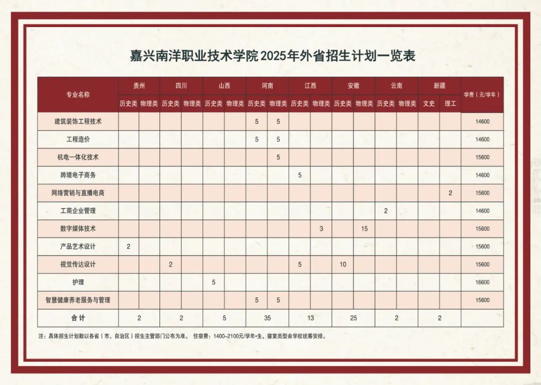 嘉兴南洋职业技术学院2025年招生总计划2900人,其中面向浙江省招生2814人(含高职提前招生400人),面向中西部8省份共招生86人。欢迎广大考生填报!