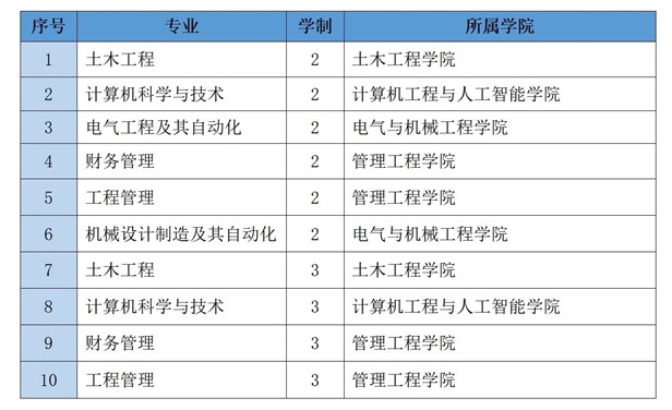 一、招生专业 2025年学校招生专业分为2年制模式和3年制模式。 2年制模式:针对3年制高职高专毕业生招生,在本科培养学校学习2年; 3年制模式:针对2年制高职高专毕业生招生,在本科培养学校学习3年。