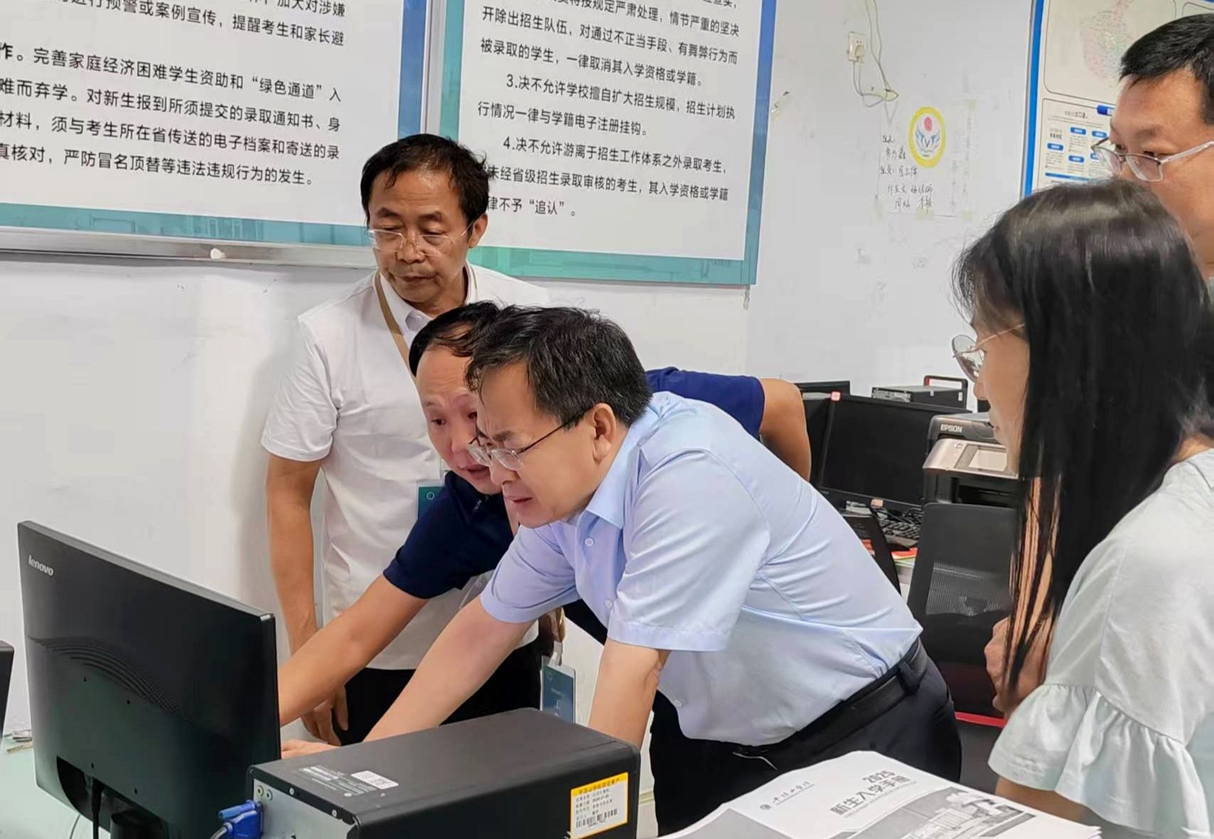 7月11日上午,校长郭秋平、副校长于长立一行到我校招生录取工作现场,检查指导2025年招生录取工作。郭秋平等一行听取了招生就业处负责同志关于我校今年招生录取工作进展情况的汇报,详细了解新高考专业组设置及考生志愿填报、招生咨询等情况。