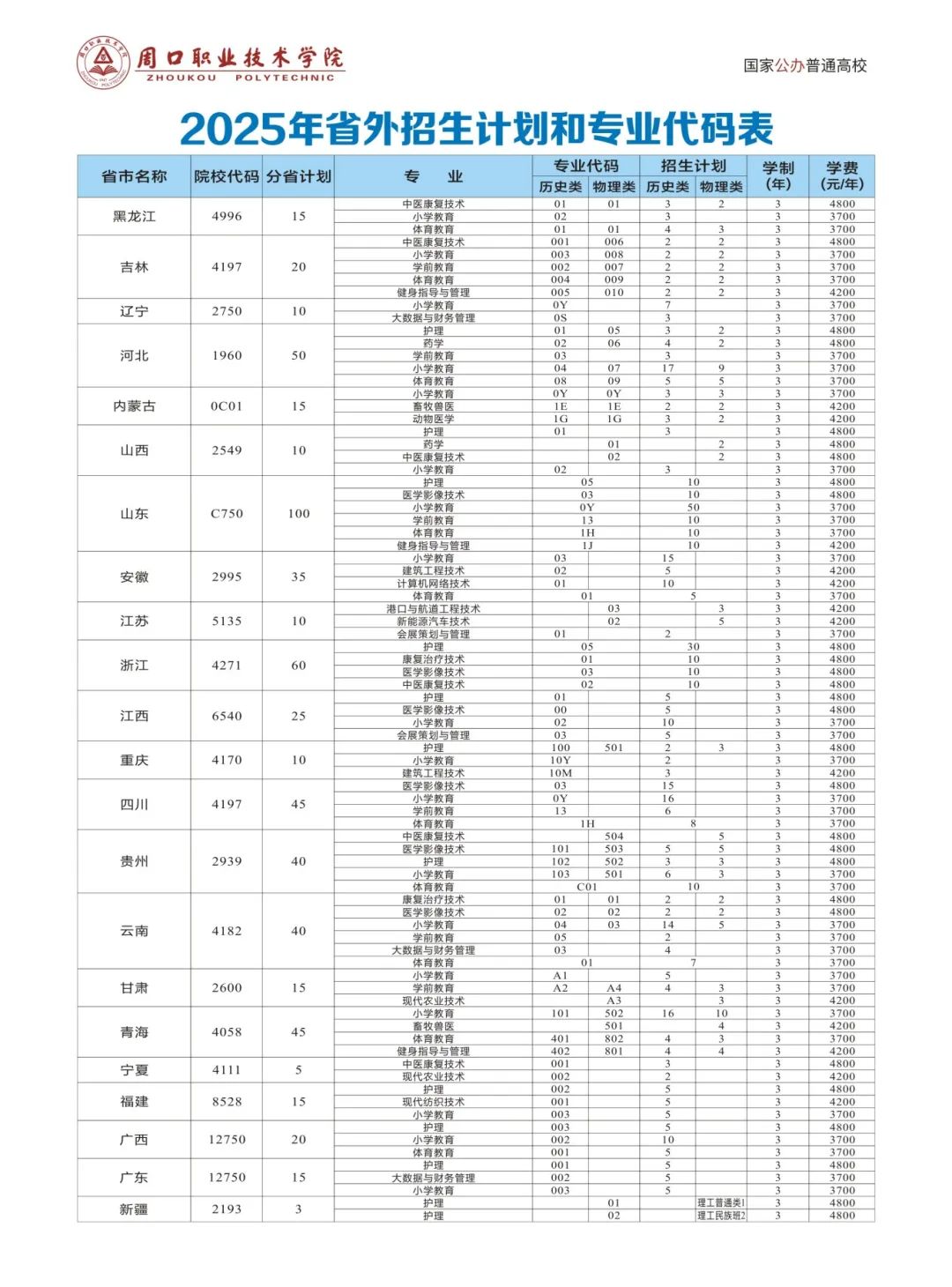 2025年外省招生计划和专业代码表