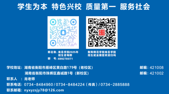 请报考我院的湖南考生注意,根据《衡阳师范学院南岳学院2025年招生章程》的录取规则,湖南考生成功投档到我院后,要主动与招生与就业工作办公室进行录取确认或者登陆南岳学院招生网链接进行网上确认,录取期间投档考生要保持手机畅通。