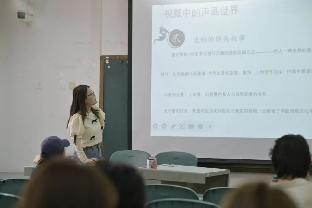 2025年5月12日,王燕老师以古风美食视频博主李子柒来引出短视频中视听语言的运用。并讲解了短视频目前发展状况、何为短视频、视频中的声画世界等内容。通过博主李子柒的短视频引出了视频中的独特光影和色彩、流畅的镜头叙事、声音的即贴近又疏离,引发了同学们的思考。并给同学们留下了一份独家作业。