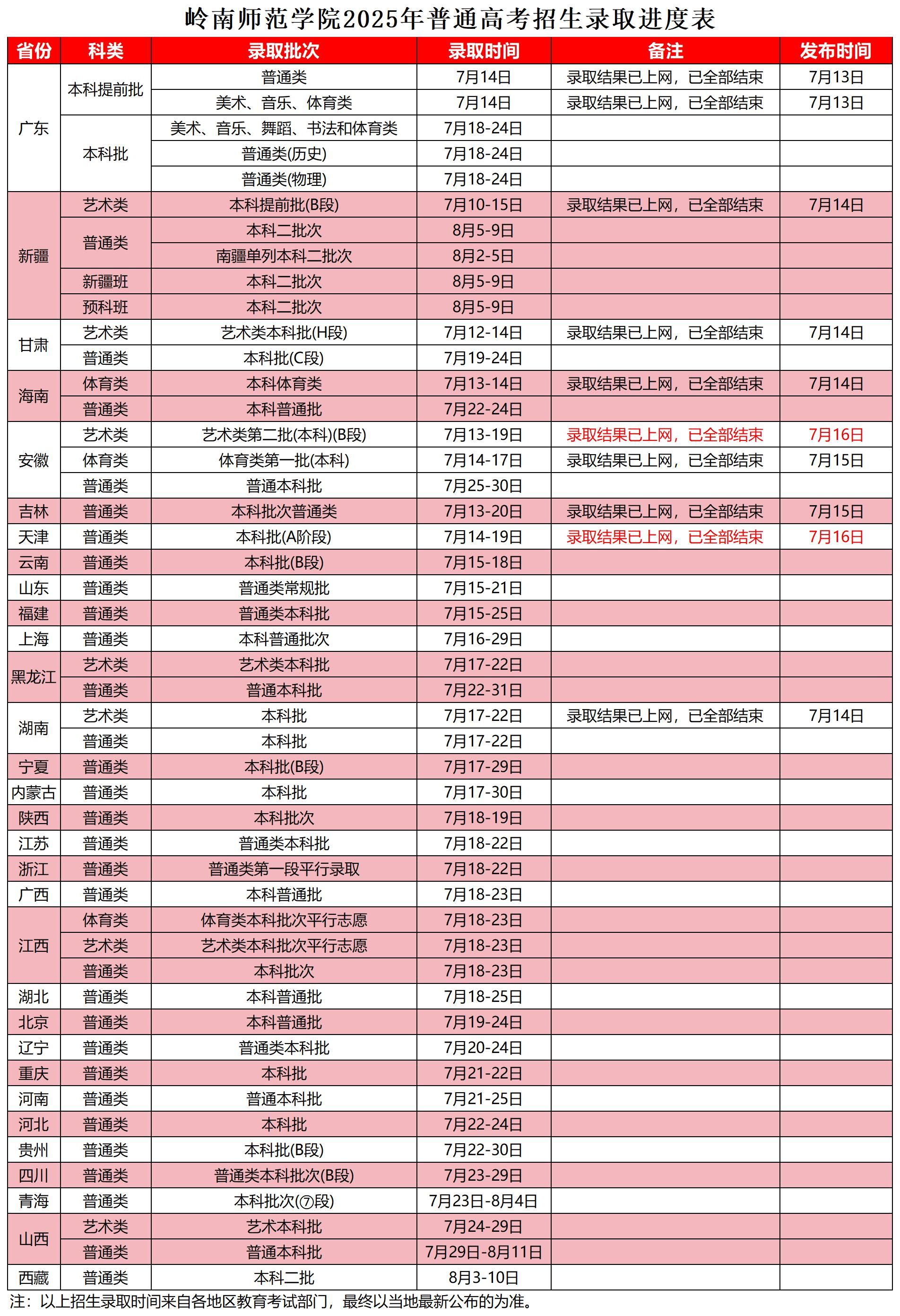 各位考生: 为方便广大考生查询录取结果,我校提供2025年招生录取结果网上在线查询, 查询入口(点击进入) 。 注:本网站不承担由于内容的不一致性所引起的一切争议和法律责任,录取结果以最终生源省考试院的数据为准。 岭南师范学院招生办公室 2025年7月