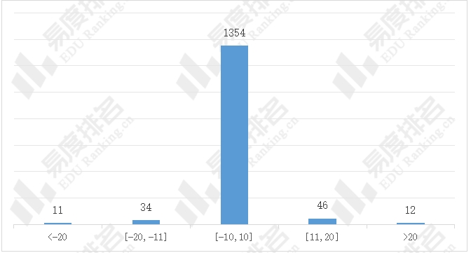可以看出超90%的院校-专业组与上一年度的同位分差在10分以内,同位分下降10以上和同位分上涨10分以上的专业组数量基本相同,整体报考难度基本维持不变。