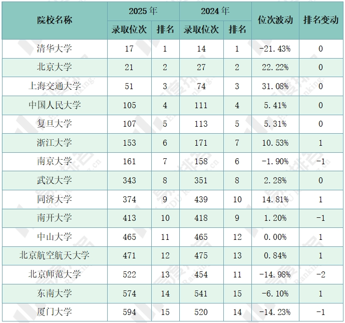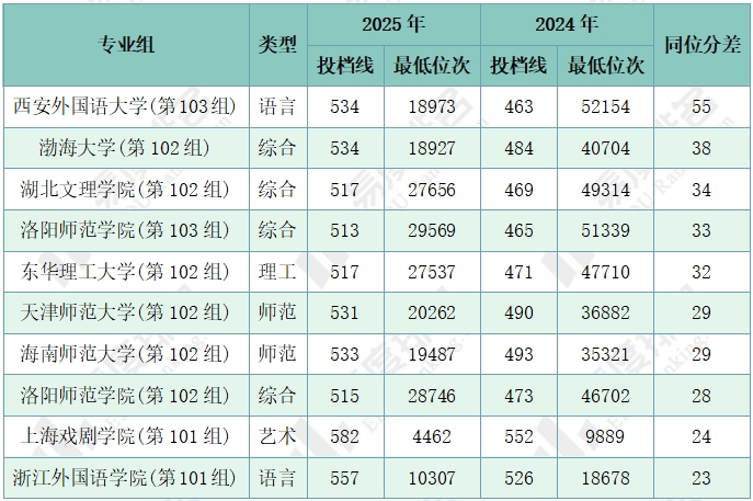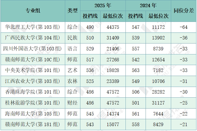 注:1.2024年同位分=2024年投档位次在2025年一分一段表中所对应的分数;2.仅含两年均招生的专业组