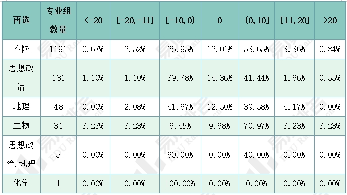 下表展示了江西院校-专业组各选科的同位分差分布情况。除了招生专业组特别少的再选科目外,各选科组均有90%以上的专业同位分差在10分以内。