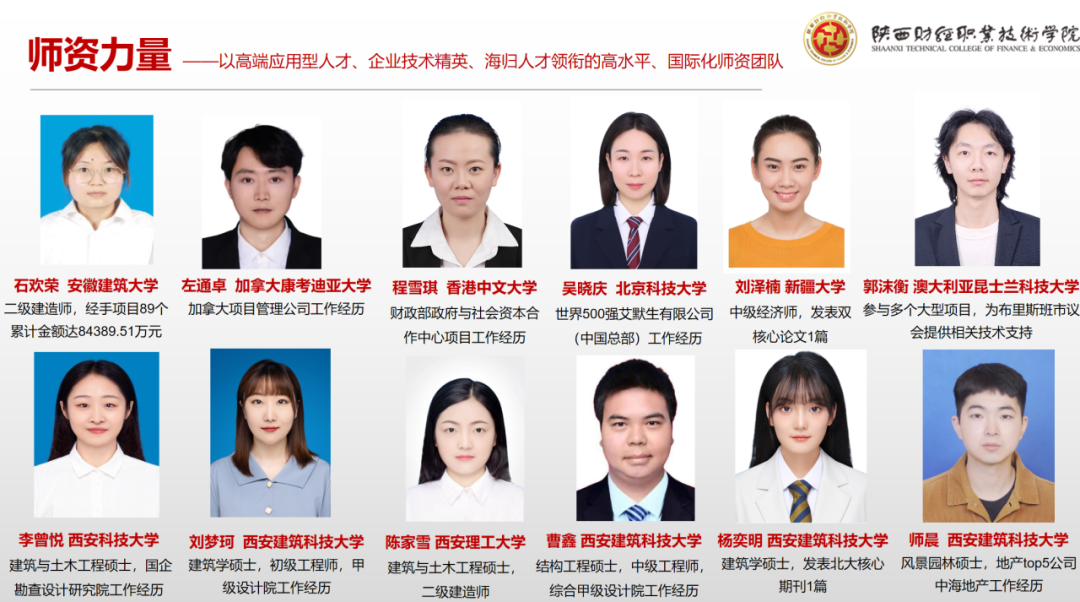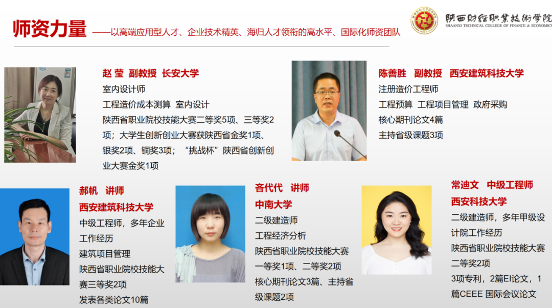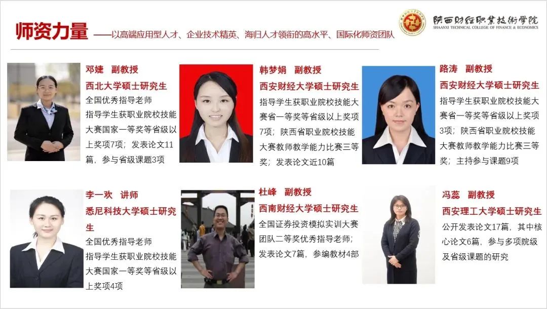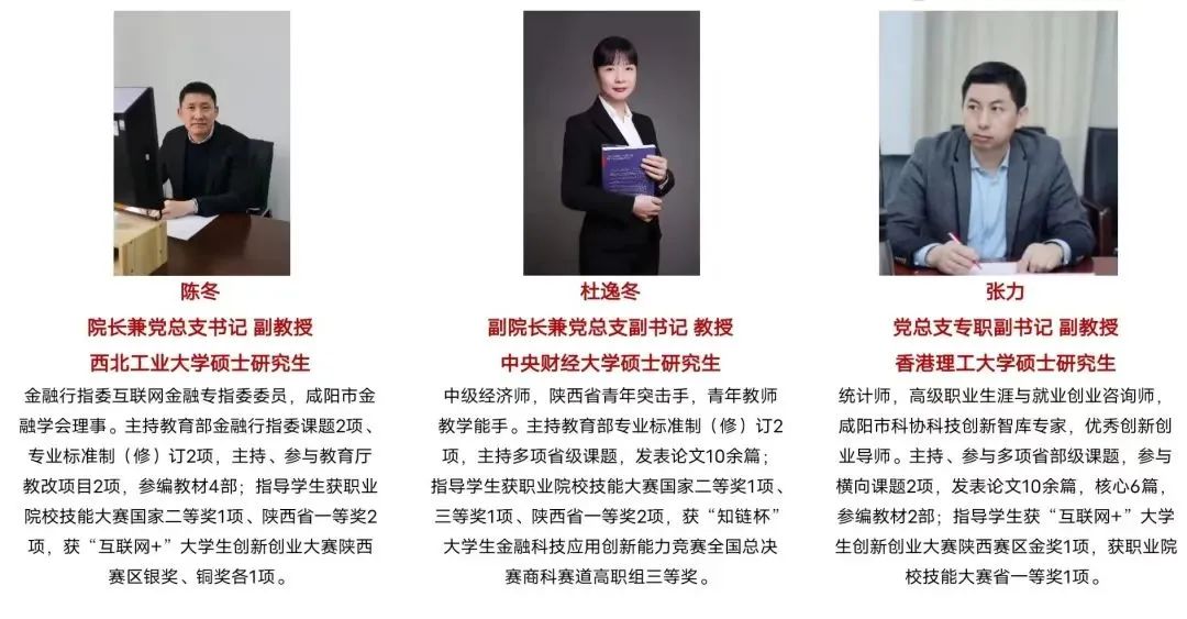 经济与金融学院是陕西省教育厅核批的创新创业试点学院,是西部地区金融类专业规模和水平“双领先”的二级学院,学院现有教职工45人,其中教授1人、副教授10人,专任教师全部具有硕士学位,双师型教师25人,具有较丰富的教学经验和企业工作经验,是一支年富力强、潜心教研、学术素养高的教师队伍。学院现开设有:金融服务与管理、金融科技应用、财富管理、工程造价、建设工程管理、建筑智能化工程技术、建筑装饰工程技术、政府采购、中小企业创业与经营和工程测量10个专业,涵盖了财经商贸类、土木建筑类与资源环境与安全类三大方向。其中金融服务与管理专业为教育部和财政部核批的提升专业服务社会能力项目、省级专业综合改革试点项目、省级“一流专业”培育项目、三年行动计划“骨干专业”等。学院长期与多家金融机构、证券公司、建设集团、采购招标公司等深度合作,每年开设5个左右订单班,校企联合共建校内理财工作室、模拟银行、工程造价实训室、创新创业实训室、政府采购实训室和30多家校外实习基地,打通了实习就业渠道,实现了学生顺利毕业和高质量就业。学院始终坚持以赛促学、以赛促教,技能竞赛成绩斐然。近年来在各类技能竞赛中先后荣获国家级一等奖3项、二等奖2项、三等奖4项,省级一等奖10项、二等奖8项、三等奖10项。特别在2022年全国职业院校技能大赛高职组“银行业务综合技能”赛项中荣获全国一等奖,实现了我校在国赛赛项中成绩新的突破。