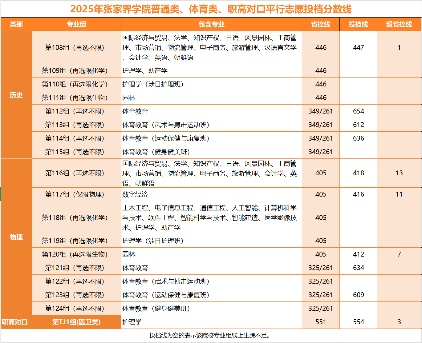 张家界学院2025年湖南普通类、体育类、职高对口平行志愿投档分数线
