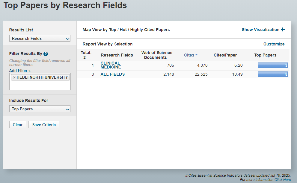 数据显示,在本次ESI统计周期(2015年1月1日至2025年4月30日)内,学校临床医学学科累计发表论文706篇,总被引4378次,其中高被引论文3篇。